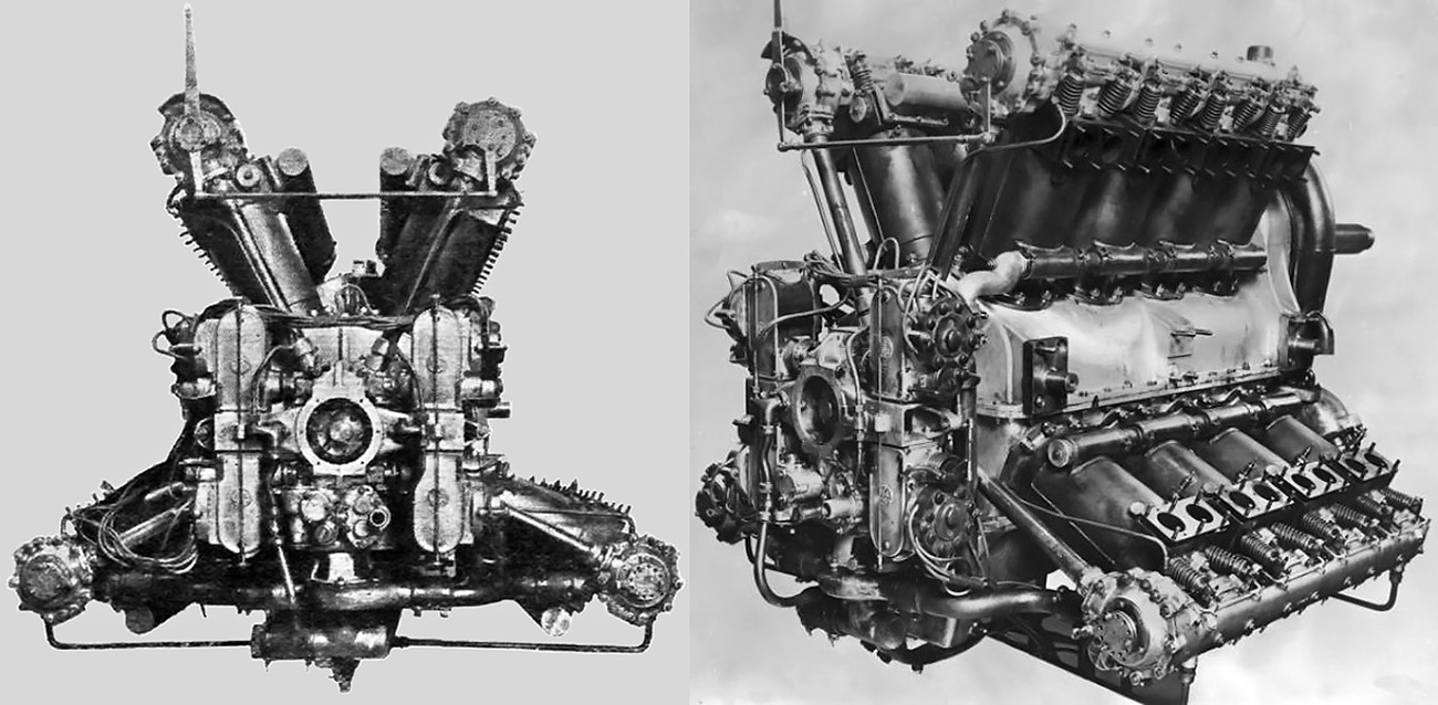 The Napier Cub was the first aircraft engine to exceed 1,000 hp (746 kW). These rear views illustrate the cylinder bank angles, the four magnetos on the back of the engine, the housings for the camshaft drive, and the exposed valves.