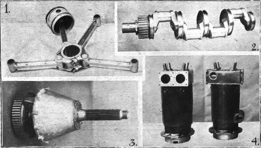 Various parts of the Napier Cub: 1) connecting rod assembly with one articulated rod attached to the bearing cap; 2) four-throw crankshaft with roller bearings and spur reduction gear; 3) propeller shaft with large spur reduction gear; 4) two of the Cub’s cylinders with the valve ports visible on the left cylinder and the water-cooling ports visible on the right cylinder.