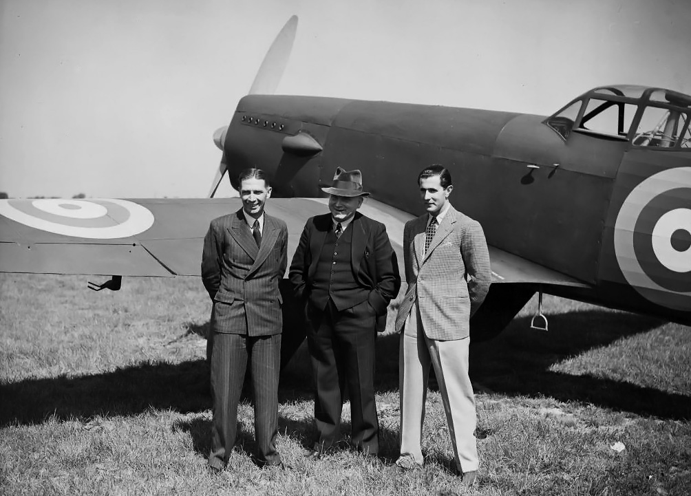 From left to right, Captain Valentine Baker, James Martin, and Francis Francis, who provided funding for the Martin-Baker Aircraft Company, stand next to the MB2.