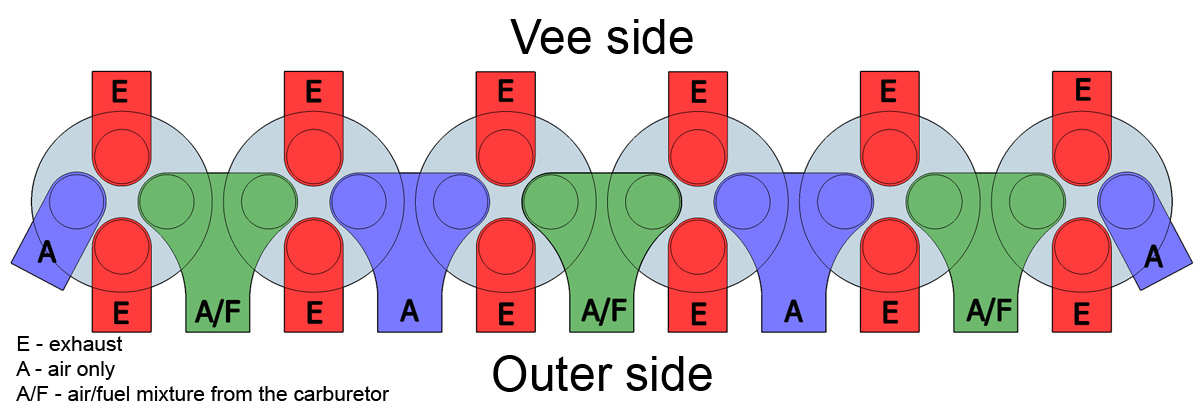 The most unusual features of the VK-108 engine were its intake and exhaust systems and the function of its four valves per cylinder. Pressurized air from the single-stage, two-speed supercharger flowed through an intake manifold located on the outer side of each cylinder bank. Each intake manifold had seven intake runners that led to the cylinder head. Four of the runners provided air only; the remaining three runners had individual carburetors to supply the air/fuel mixture to the cylinders. The first runner supplied just air to the first cylinder. The second runner provided the air/fuel mixture to the first and second cylinders. The third runner supplied just air to the second and third cylinders. The fourth runner provided the air/fuel mixture to the third and fourth cylinders. The fifth runner supplied just air to the fourth and fifth cylinders. The sixth runner provided the air/fuel mixture to the fifth and sixth cylinders. The seventh runner supplied just air to the sixth cylinder. So each carburetor supplied air/fuel for two cylinders; the engine had a total of six carburetors.