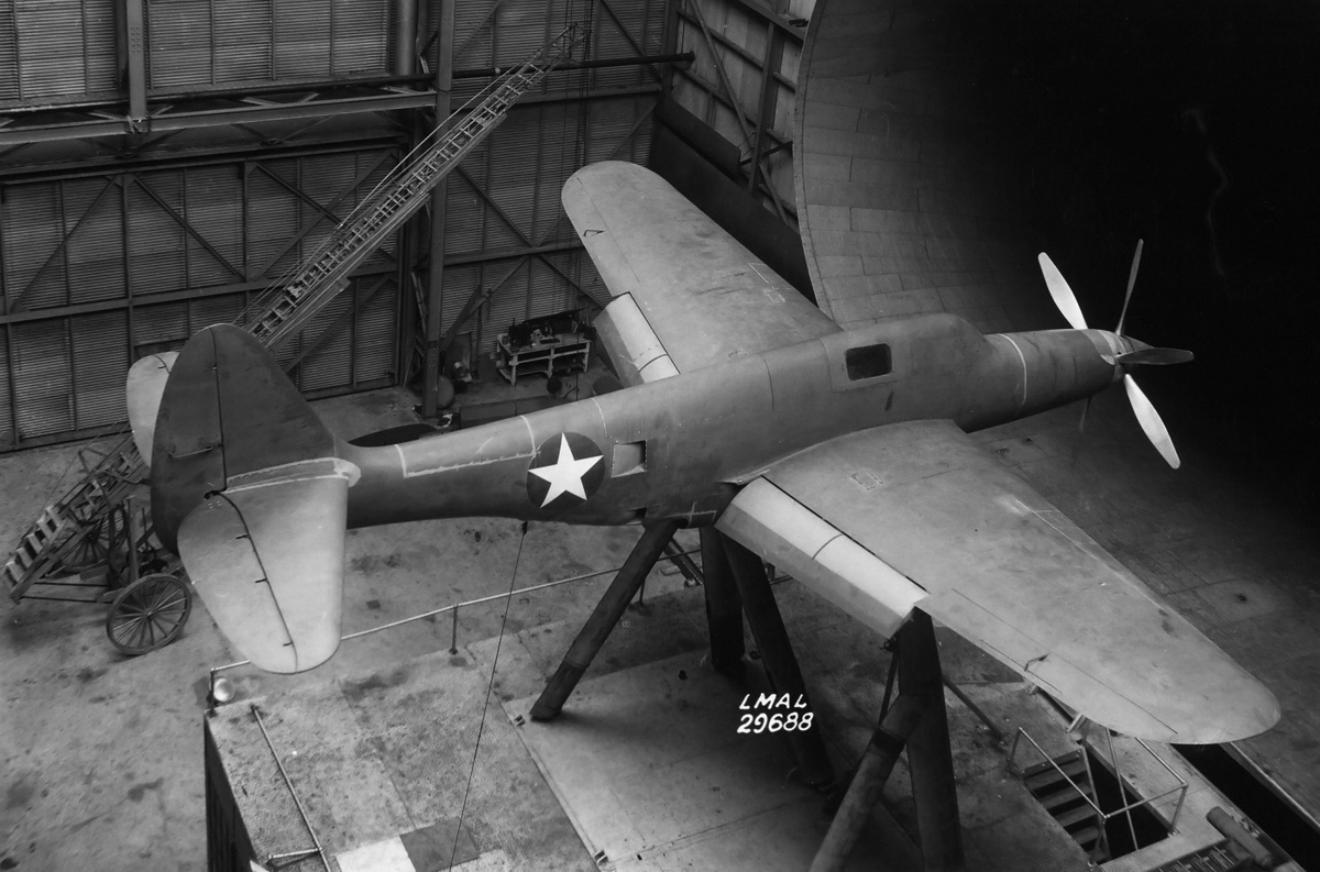 The Republic XP-69 model undergoing wind tunnel tests. Note the revised belly scoop and the air exits on the rear fuselage. The man pictured at the bottom of the photo gives some scale to the large size of the model, which was 3/4-scale. (image via Langley Memorial Aeronautical Laboratory / NASA)
