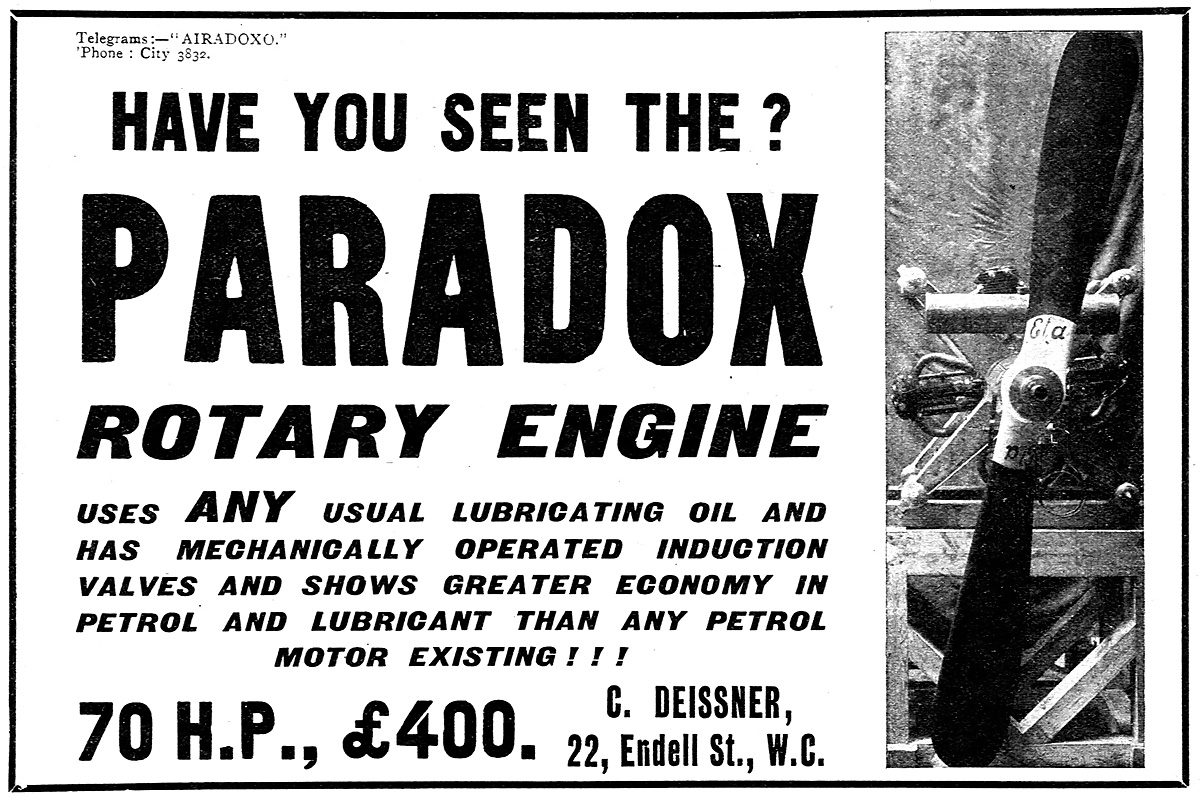 As early aviators began to take flight, it quickly became apparent that most engines were not suitable for use in aircraft. A number of engineers and designers worked to create light and powerful engines that were ideal for aircraft use. Some of these designs, such as the Antoinette, lay the foundation for many engines to follow, but other engine designs were quickly abandoned. Like many others, Charles (Carl) Deissner of London, England designed one of the engines destined to go nowhere. Deissner called his engine the Paradox.