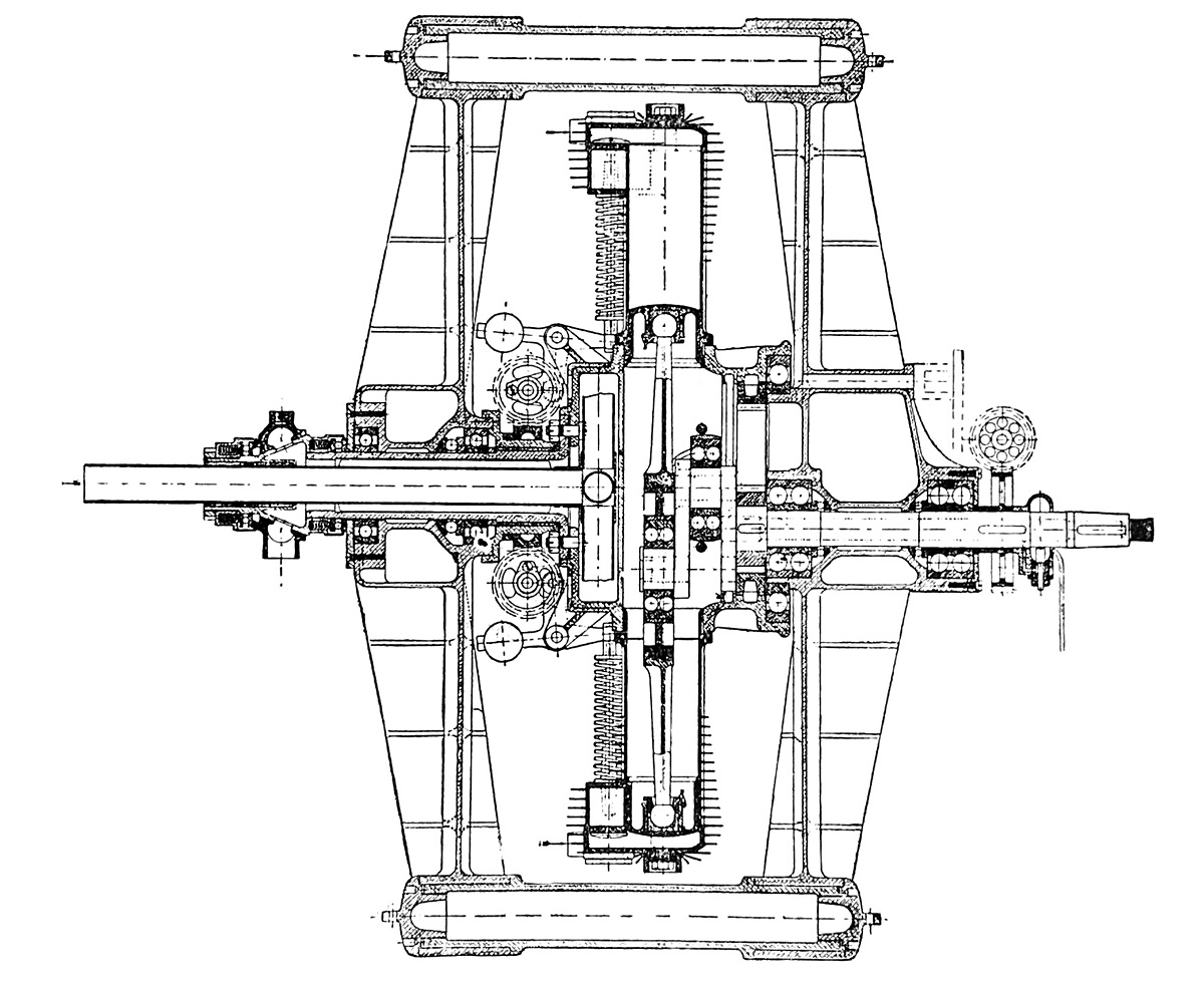 Sectional view of the 30 hp (22 kW) Paradox engine. The valves can be seen on the front of the L-head cylinders. Below the valves are the pushrods actuated by counter-weighted rockers. The rockers are driven by a short camshaft extending on each side of a pinion. The pinion rotates as its teeth mesh with a gear fixed to a stationary shaft at the front of the engine.