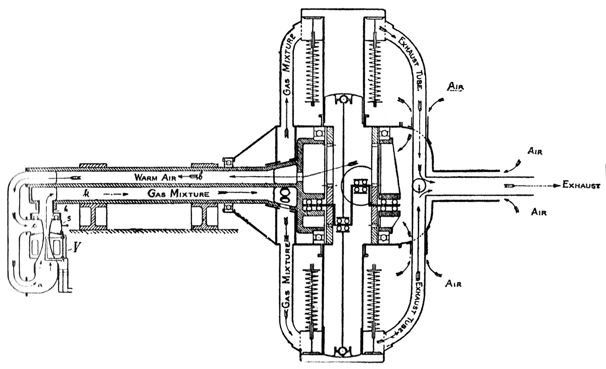 Induction air was brought in through a carburetor at the front of the engine. The air/fuel mixture then passed through the crankcase, where it was warmed, and into separate manifolds for each cylinder. Exhaust was taken through a manifold from each cylinder, piped through the crankcase, and vented out the front of the engine’s propeller shaft, which was fixed to the crankcase.