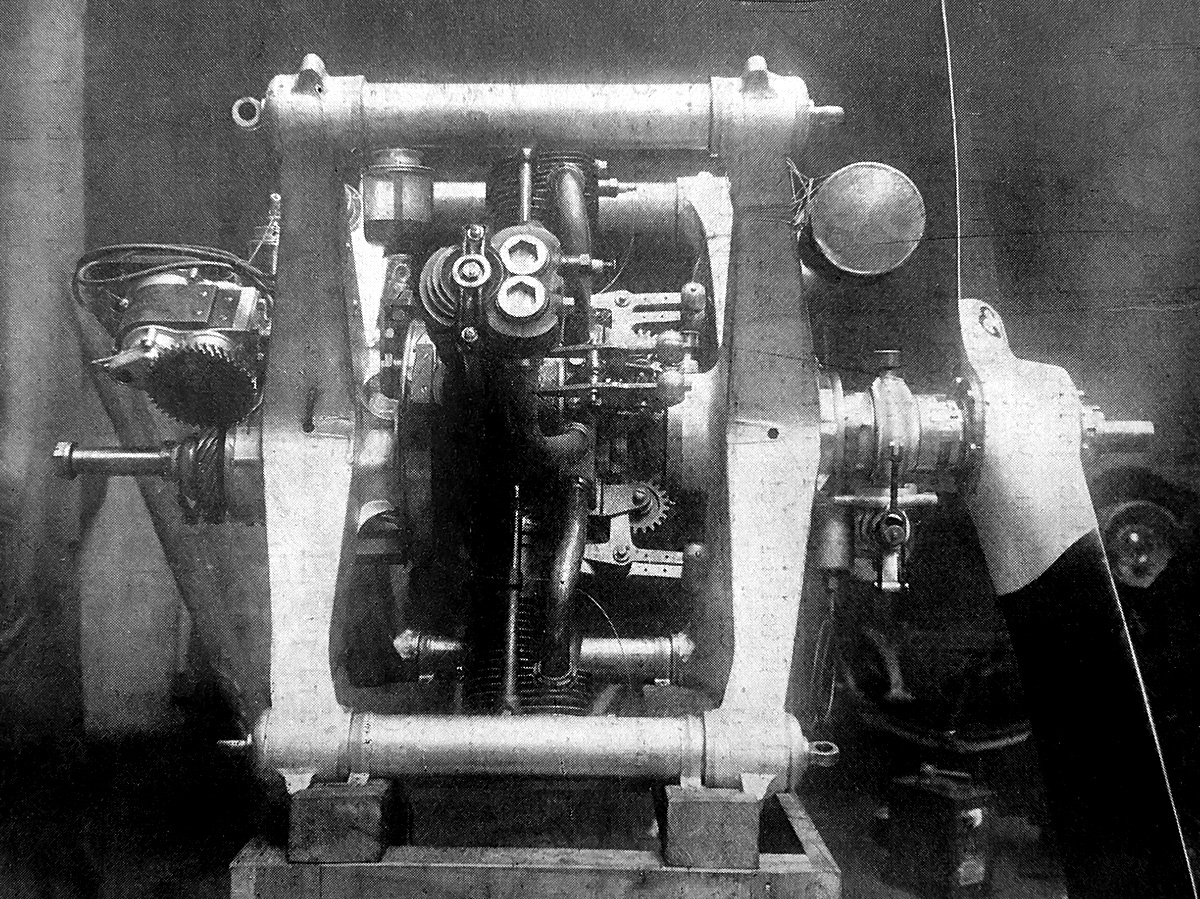 The 30 hp (22 kW) Paradox engine complete with propeller. Note the skew gear-driven magneto, counter-weighted rocker arms, and the cylinders’ L-head design.