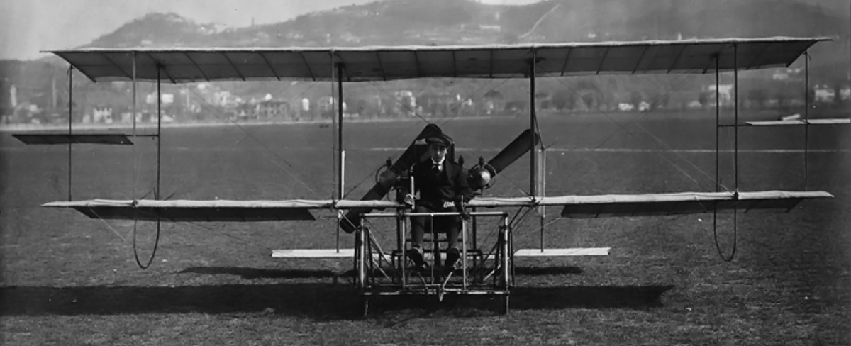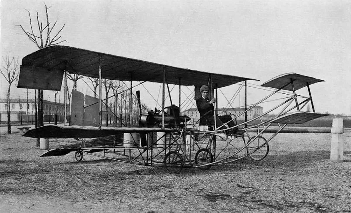 Mario Faccioli sits on the Faccioli N.3 aircraft in 1910. Note the covers over the N.2 engine’s cross shaft bevel gears. Since the propellers rotated in opposite directions, when one was vertical, the other was horizontal.