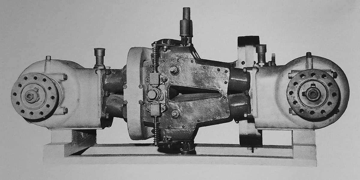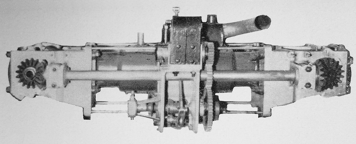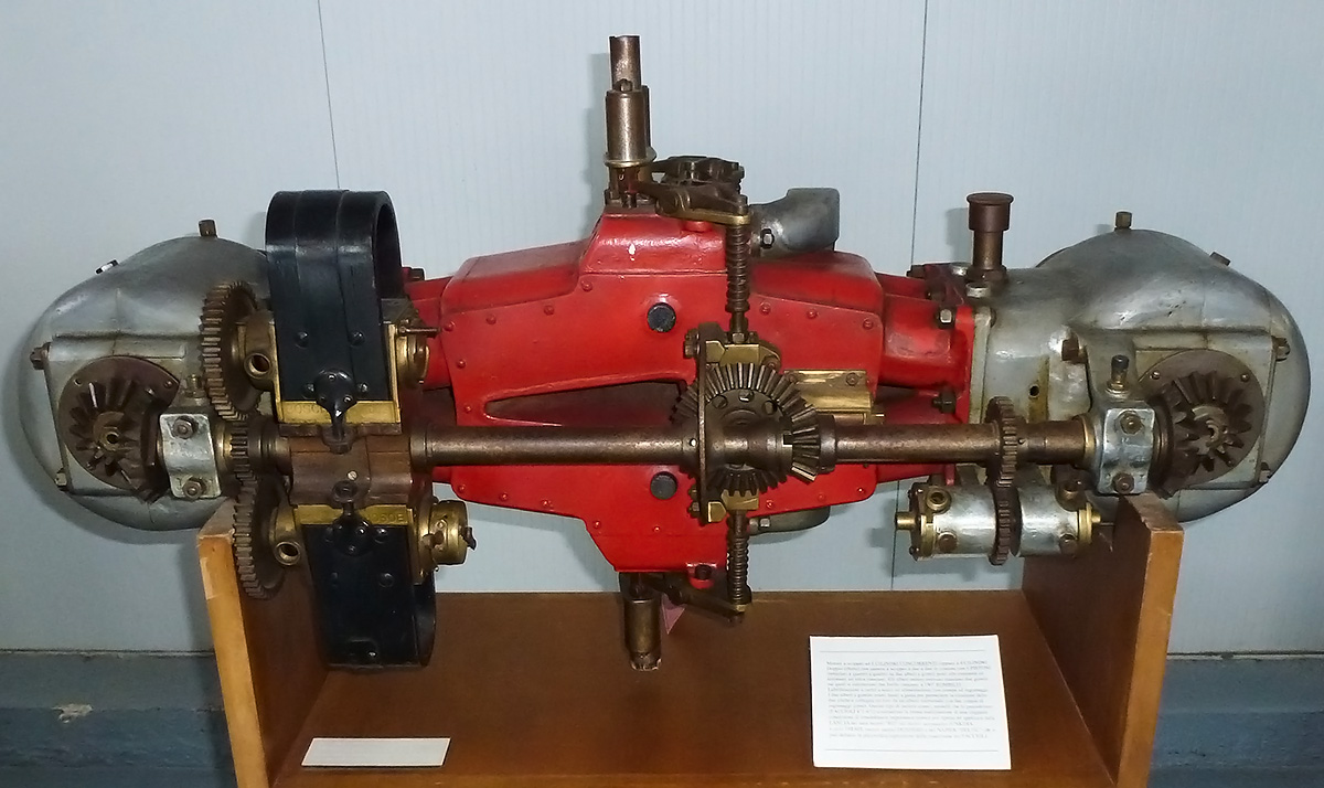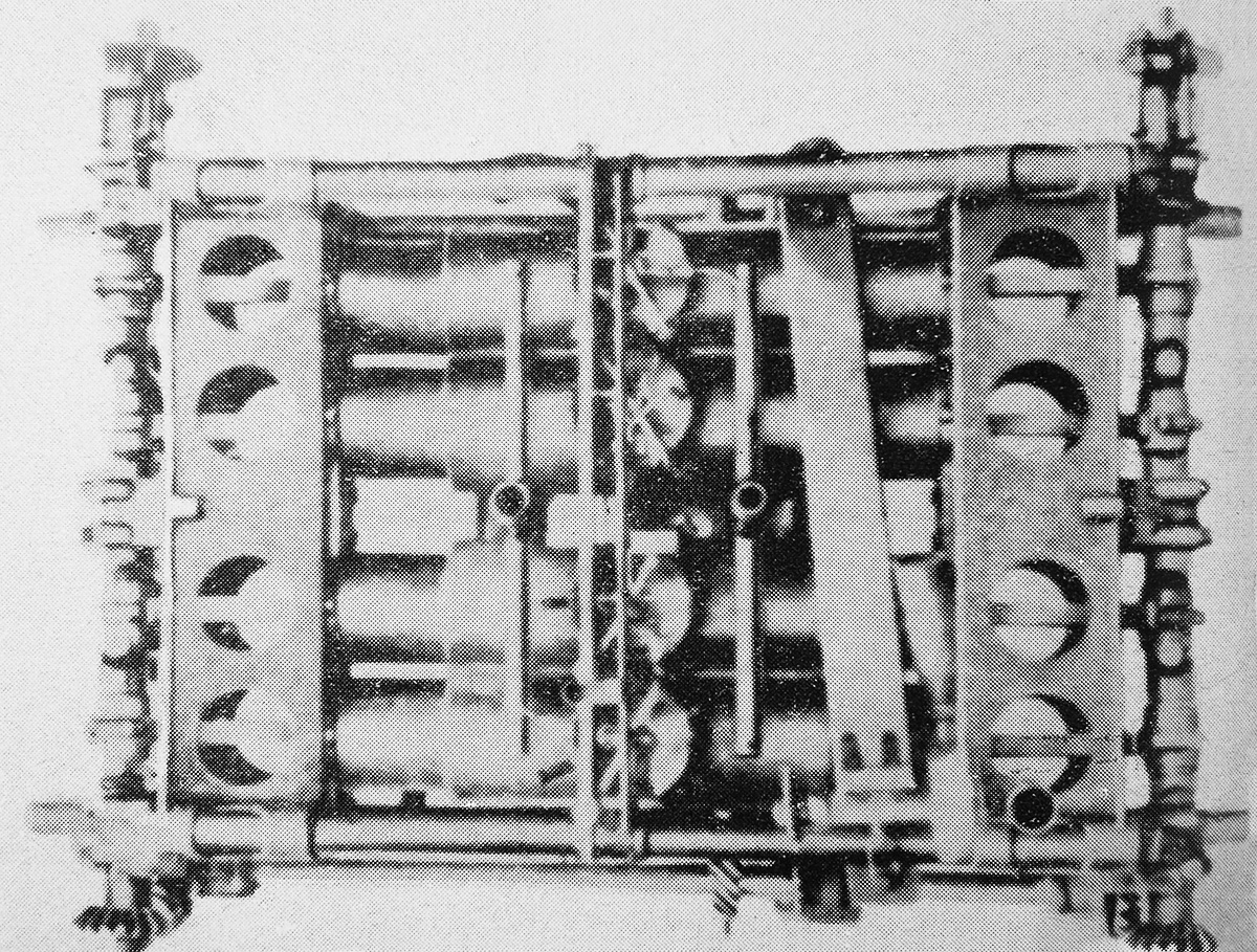 The SPA-Faccioli N.1 engine with its four cylinders, each housing two opposed pistons. At the rear of the engine (bottom of image) is the cross shaft linking the two crankshafts. Note the gear on the cross shaft that drove the camshaft.
