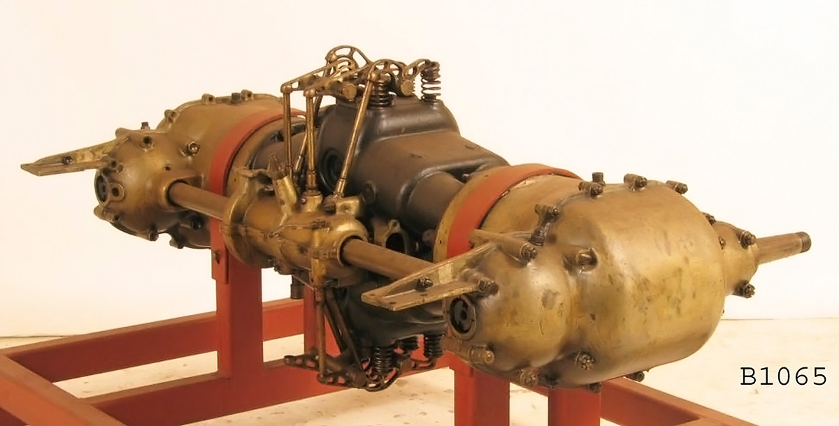 This rear view of the N.4 engine shows how the cross shaft also acted as the camshaft and directly drove the pushrods. The valves in the foreground are for the intake. The port for the intake manifold can just be seen at the center of the engine. Note the mounts for the magnetos and that the engine is upside-down in its display stand. (Museum of Applied Arts & Sciences image)
