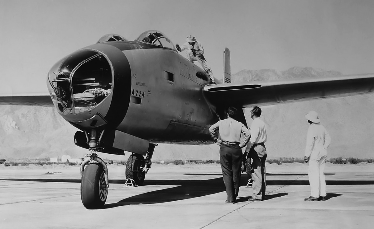 The guns in the left wing are seen aimed 30 degrees up and 25 degrees inboard. Only the second aircraft was fitted with the guns, and they were never tested. Note the snap-action doors that covered the guns. When open, the doors increased the XB-42’s directional stability, resulting in additional rudder force to give the desired yaw.