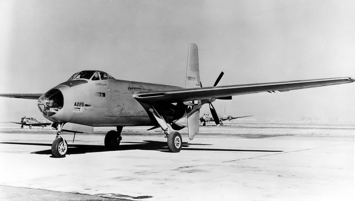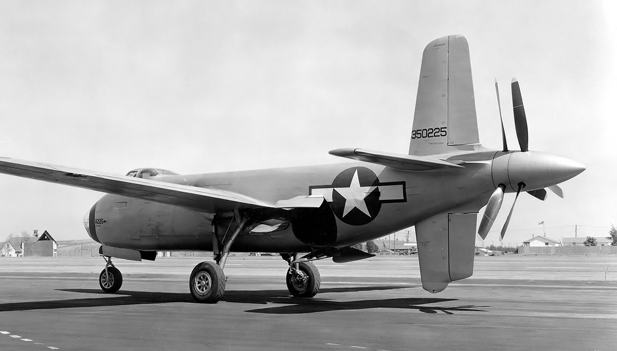 The Douglas XB-42 Mixmaster had a unique design that provided very good performance. However, it was too late for World War II and too slow compared to jet aircraft. The first prototype (43-50224) is seen with its short tail on an early test flight.