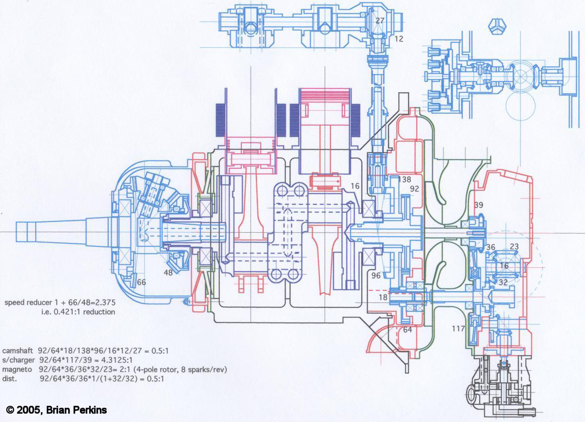 A sectional view of the Hydra created by Brian Perkins and based on a drawing found in the Bristol archives. The numbers in the drawing relate to the number of gear teeth. Note the unsupported crankshaft center section that joined the front and rear crankshaft sections. (Brain Perkins drawing via the Aircraft Engine Historical Society)