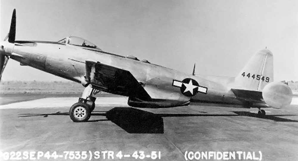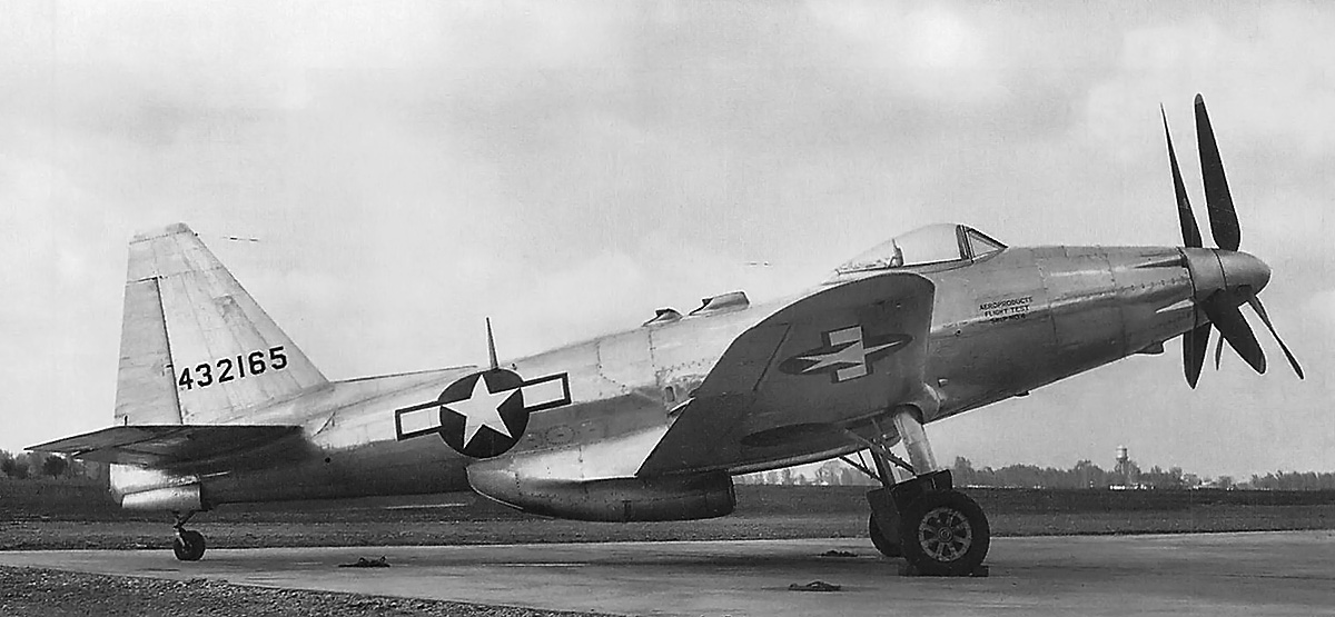 The 2,600 hp (1,939 kW) Allison V-3420-19 engine with a two-stage supercharger was positioned in the fuselage behind the pilot. Each of the engine’s four cylinder banks had an air-cooled exhaust manifold with two exhaust stacks protruding out of the fuselage. Two extension shafts passed under the cockpit and connected the engine to the remote gear reduction box for the Aeroproducts six-blade contra-rotating propeller. Two different types of propellers were used. Initially, a 13 ft (3.96 m) diameter, narrow, A-blade design was used. Many sources state that this propeller was used on the first 12 aircraft. However, some of these aircraft flew with the second design, a 12 ft 7 in (3.84 m) diameter, wide, H-blade. The gear reduction turned the propeller at .407 crankshaft speed.