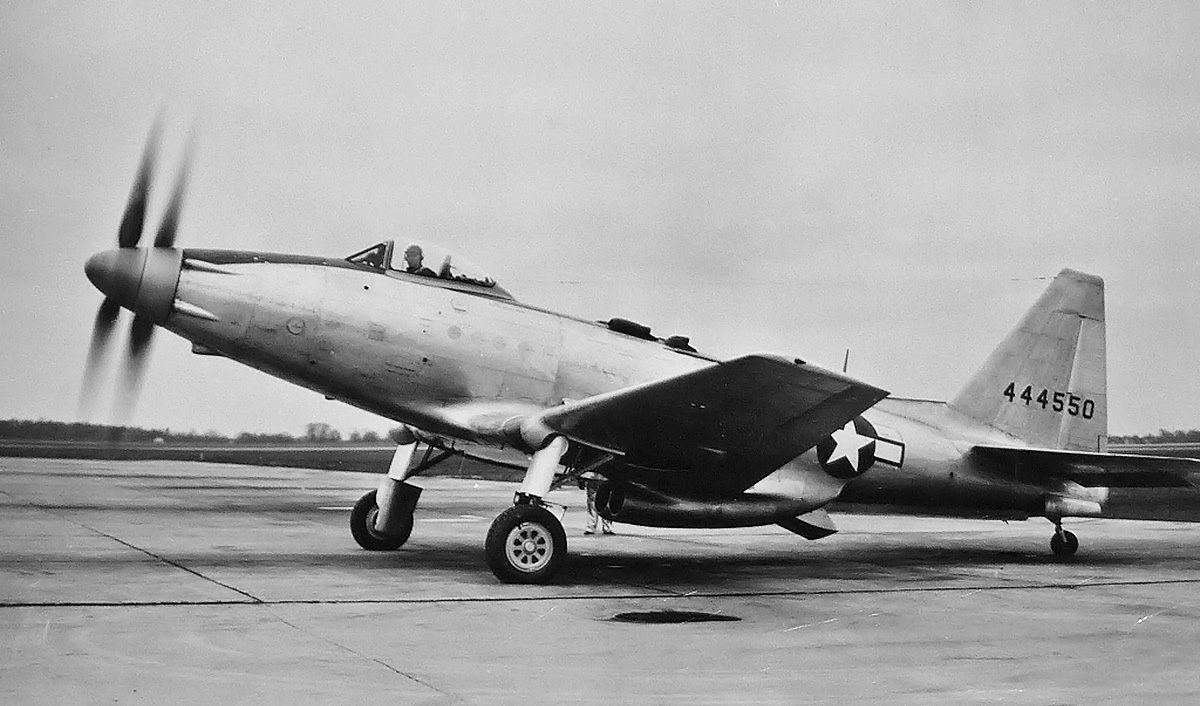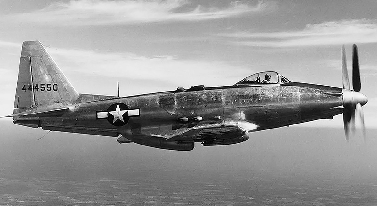 The pilot under 44-44550’s bubble canopy helps illustrate the aircraft’s rather large size. The P-75’s sluggish handling and lateral instability did not endear the aircraft to test pilots. Note the nearly-wide-open rear shutter of the belly scoop.