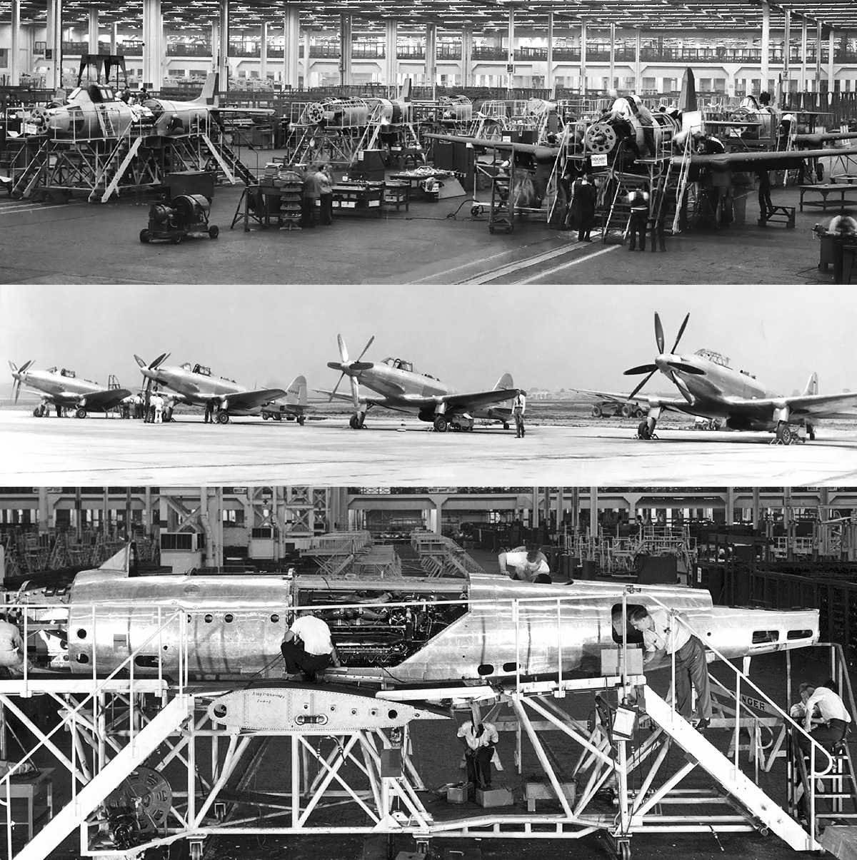 The top image shows at least five XP-75A aircraft under construction. The middle image, from right to left, shows the first two XP-75 aircraft (43-46950 and 43-46951) and the first two XP-75A aircraft (44-32161 and 44-32162). The second XP-75 (second from the right) has the wide H-blade propellers installed, while the other aircraft have the narrow A-blade propellers. The bottom image is a P-75A under construction. Note the V-3420 engine. (Veselenak Photograph Collection / National Museum of the US Air Force images)
