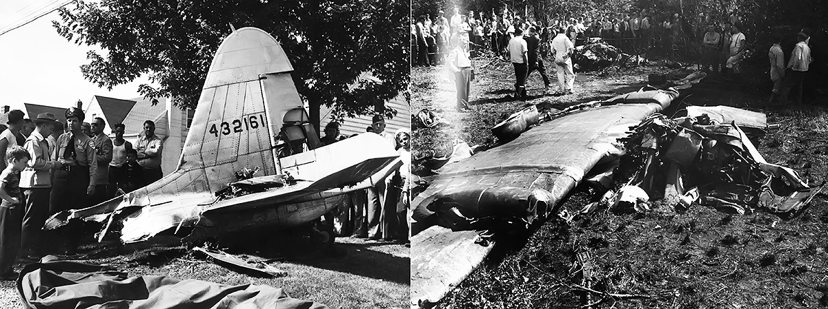 The empennage (left) and inverted wings and fuselage (right) of XP-75A 44-32161 after its crash on 5 August 1944. An engine explosion and inflight fire led to the empennage separating from the rest of the aircraft. Russell Weeks, the pilot, was able to bail out of the stricken aircraft. (Veselenak Photograph Collection / National Museum of the US Air Force images)