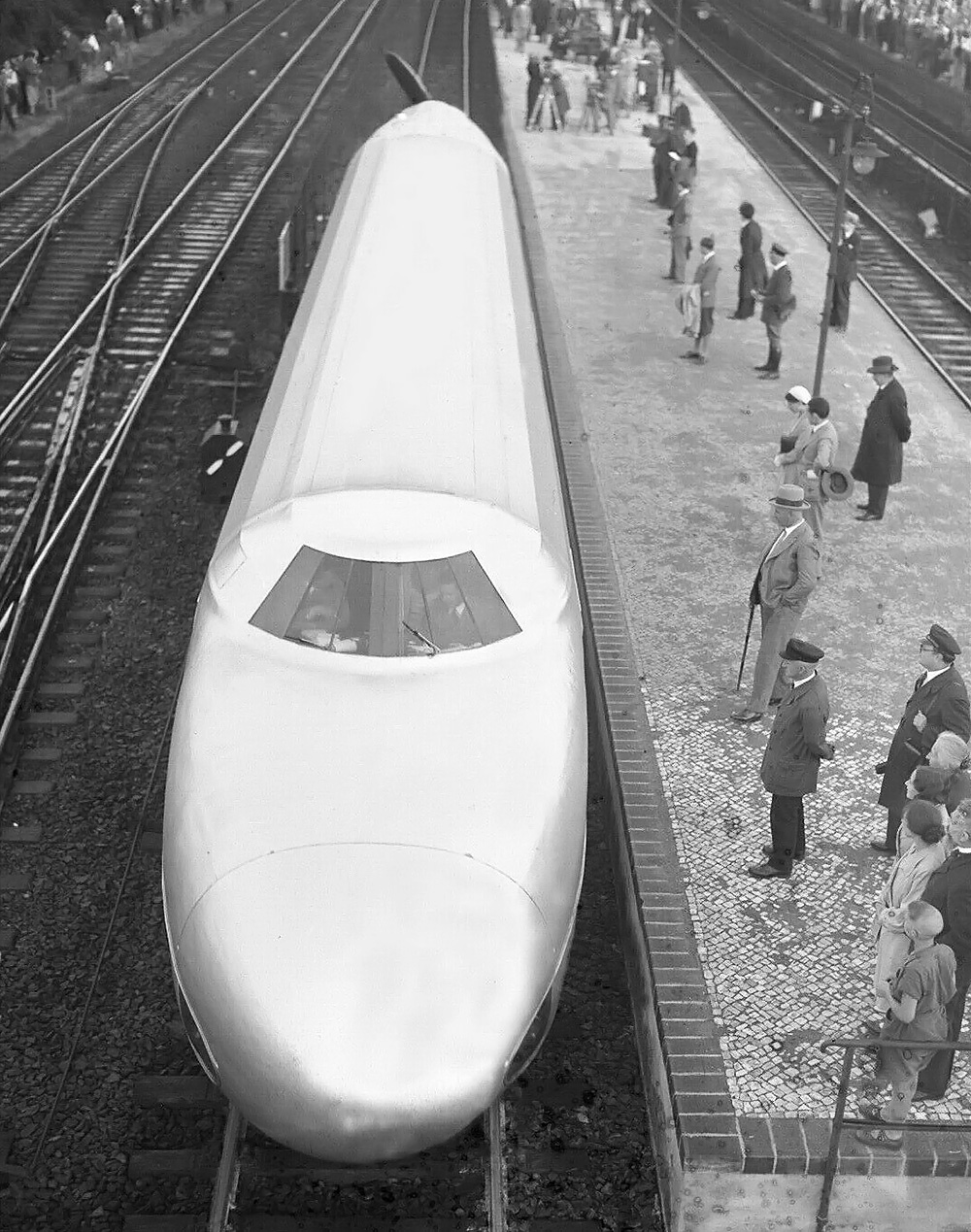 Testing on the isolated track continued until May 1931, when the Rail Zeppelin was operated on the main line. However, no German insurance company would cover the propeller-driven train, and arrangements had to be made with Lloyd’s of London for coverage. The main line test was a 12.2-mile (19.7-km) stretch between Plockhorst and Lehrte. The Rail Zeppelin drew quite a crowd wherever it operated, necessitating a police presence to control the spectators. On 10 May, the machine covered the distance in 10 minutes and reached a top speed of 127 mph (205 km/h).