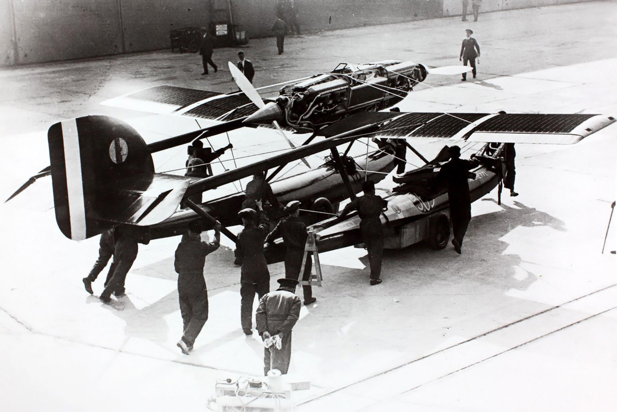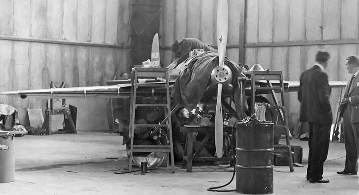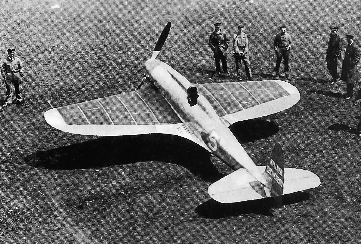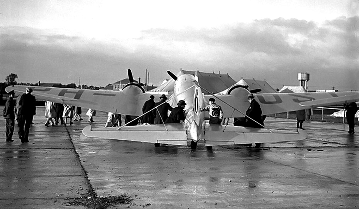 Elevated view of the 28VD illustrates the surface radiators covering the upper wings. Note the vents in the wing’s trailing edge fairing. The race number “5” has been applied to the fuselage. This image was most likely taken on 14 May 1933, the day of the accident, as the aircraft is prepared for its qualification flight.