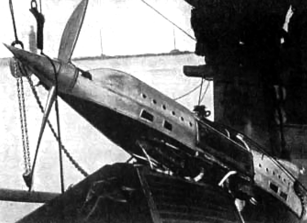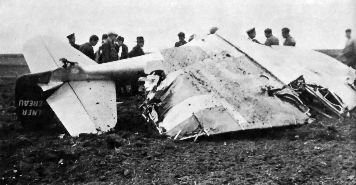 The remains of the 28VD after its forced lading. The landing gear and engine have been ripped away, and the fuselage is broken at a right angle behind the wing. The surface radiators under the outer wing are visible. The circular openings seen in the wing’s underside are the dump valves for two of the three fuel tanks.