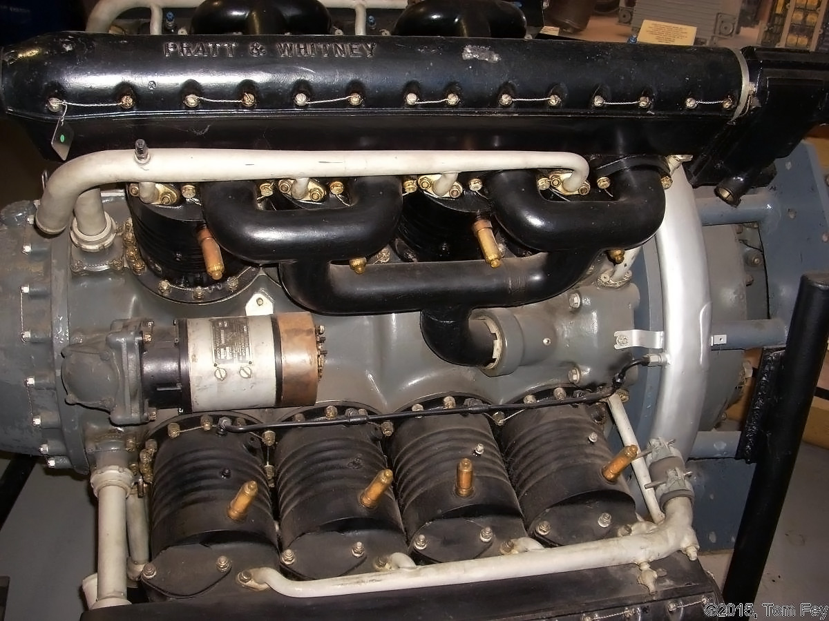 A single-barrel updraft carburetor was positioned on the outer side of the right cylinder bank. An intake pipe led from the carburetor, passed between the two cylinder pairs of the right bank, and joined a manifold. The manifold split into four branches that fed each of the cylinders on the right bank. Employing a similar configuration, a two-barrel carburetor on the left side of the engine fed both the left and center cylinder banks. Each cylinder had two spark plugs that were fired by two magnetos located at the rear of the engine. The left magneto fired the spark plugs on the intake side of the cylinders, and the right magneto fired the exhaust-side spark plugs.
