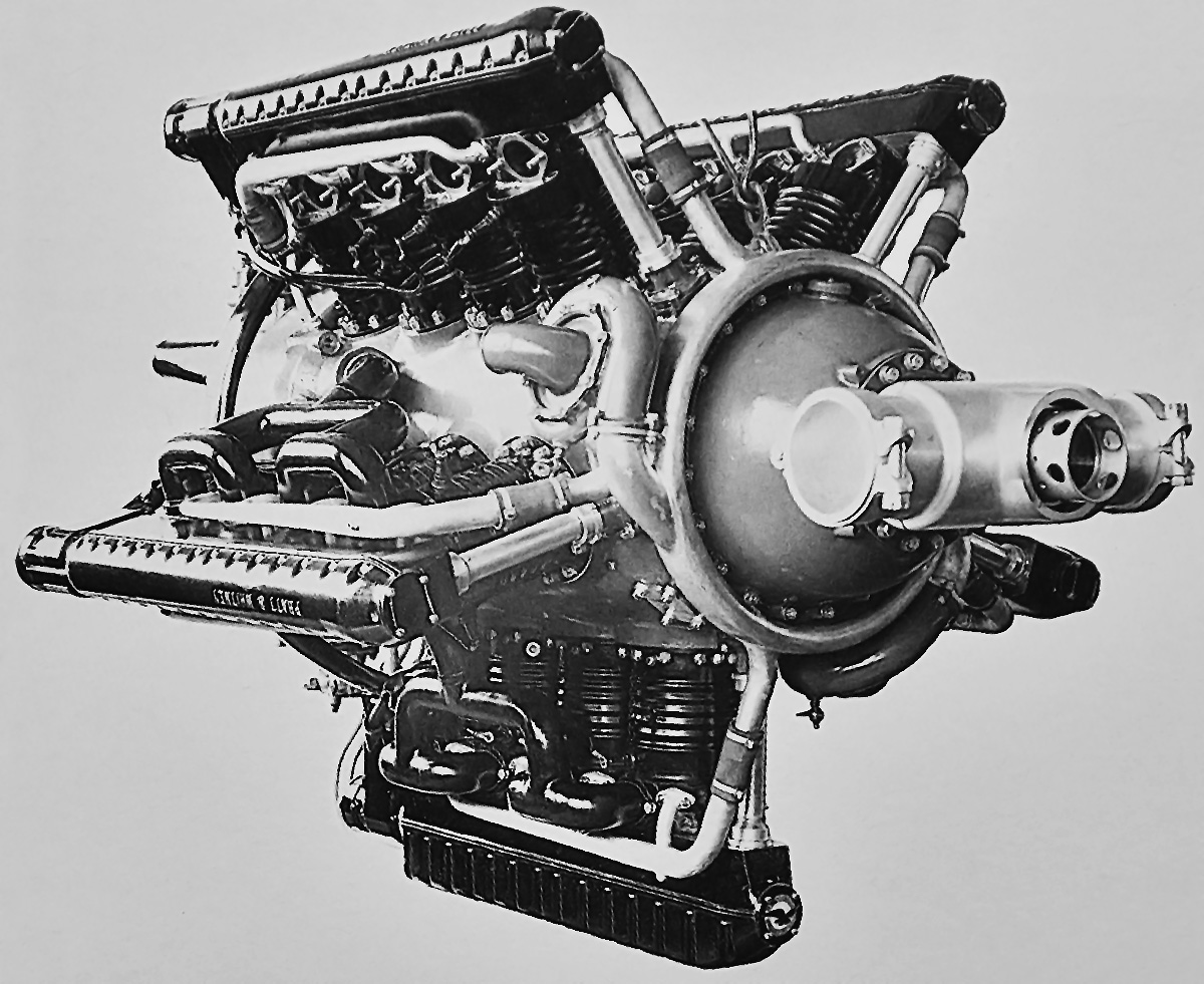 In November 1934, a supercharged version of the 18G Orion was displayed at the salon de l’Aviation in Paris. An updraft carburetor fed the gear-driven, centrifugal supercharger that was mounted to the rear of the engine. Three intake manifolds delivered the air and fuel mixture to the cylinder banks, just like the 12Fb engine. The revised cylinder banks included four valves per cylinder that were actuated by dual overhead camshafts. Each camshaft pair was driven by a vertical shaft at the rear of the engine. The supercharged 18G produced 1,050 hp (783 kW) at 2,150 rpm, but no additional specifications have been found.