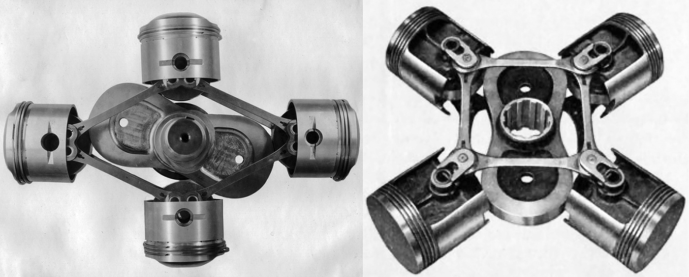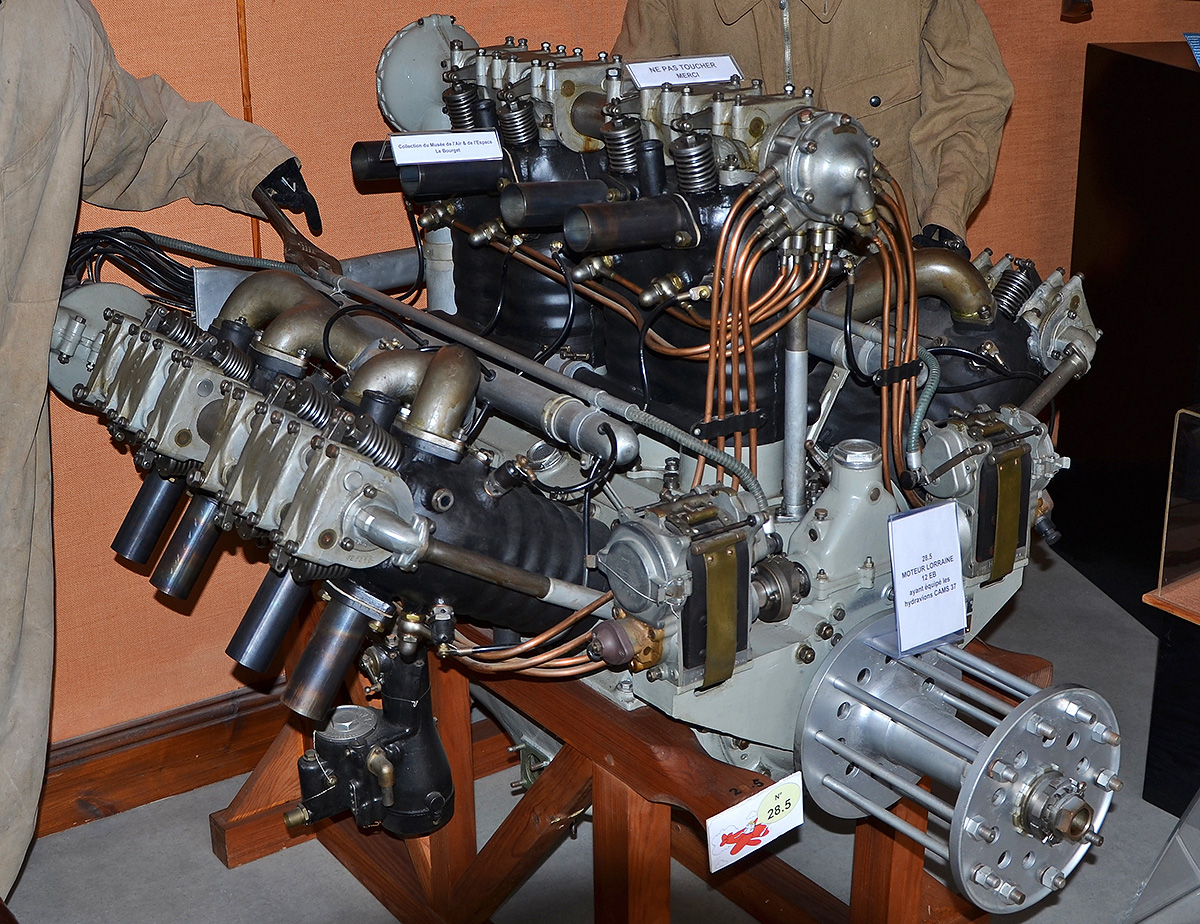 The first generation of Lorraine’s W engines was designed around 1918 and known as the 12F (many sources do not give a designation for this engine, and “12F” was used again). The liquid-cooled, 12-cylinder engine consisted of a two-piece aluminum crankcase that was split horizontally along the crankshaft’s axis. Three banks of cylinders were mounted atop the crankcase, and the left and right banks were angled 60 degrees from the center, vertical bank. Each cylinder bank had two pairs of two cylinders. Each pair of steel cylinders was surrounded by a welded steel water jacket. Atop each cylinder was a single intake valve and a single exhaust valve. The enclosed valves were each actuated by a partially exposed rocker and a fully exposed pushrod. All of the pushrods were controlled by two camshafts—one positioned in each Vee between the cylinder banks. The push rods that controlled the exhaust valves for the left and right cylinder banks had a lower roller rocker that followed the camshaft.