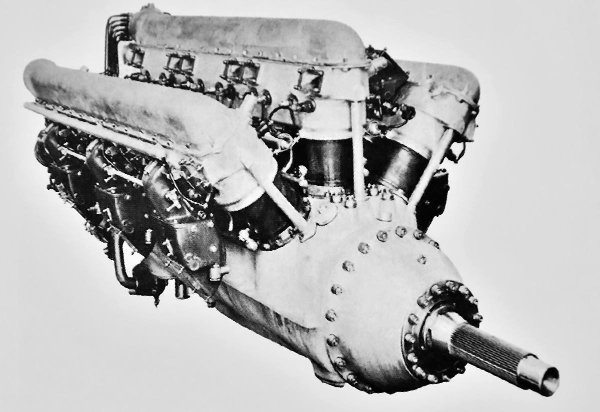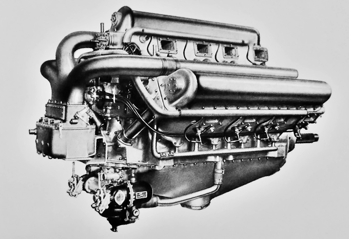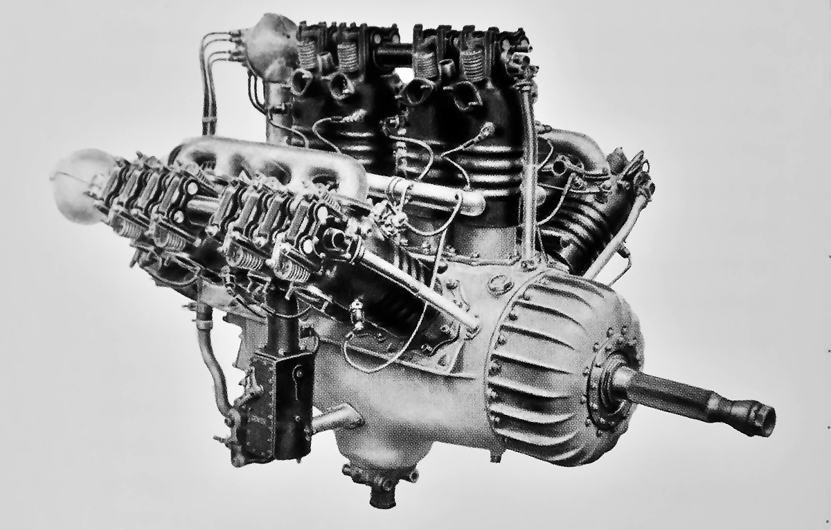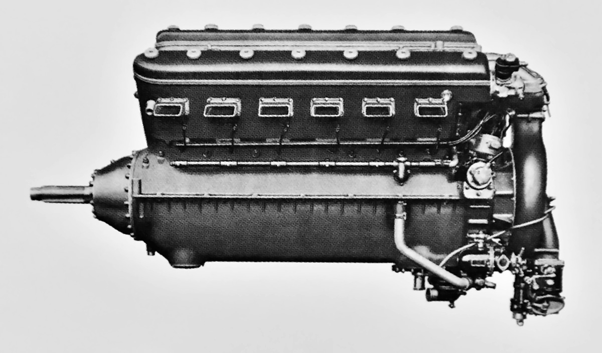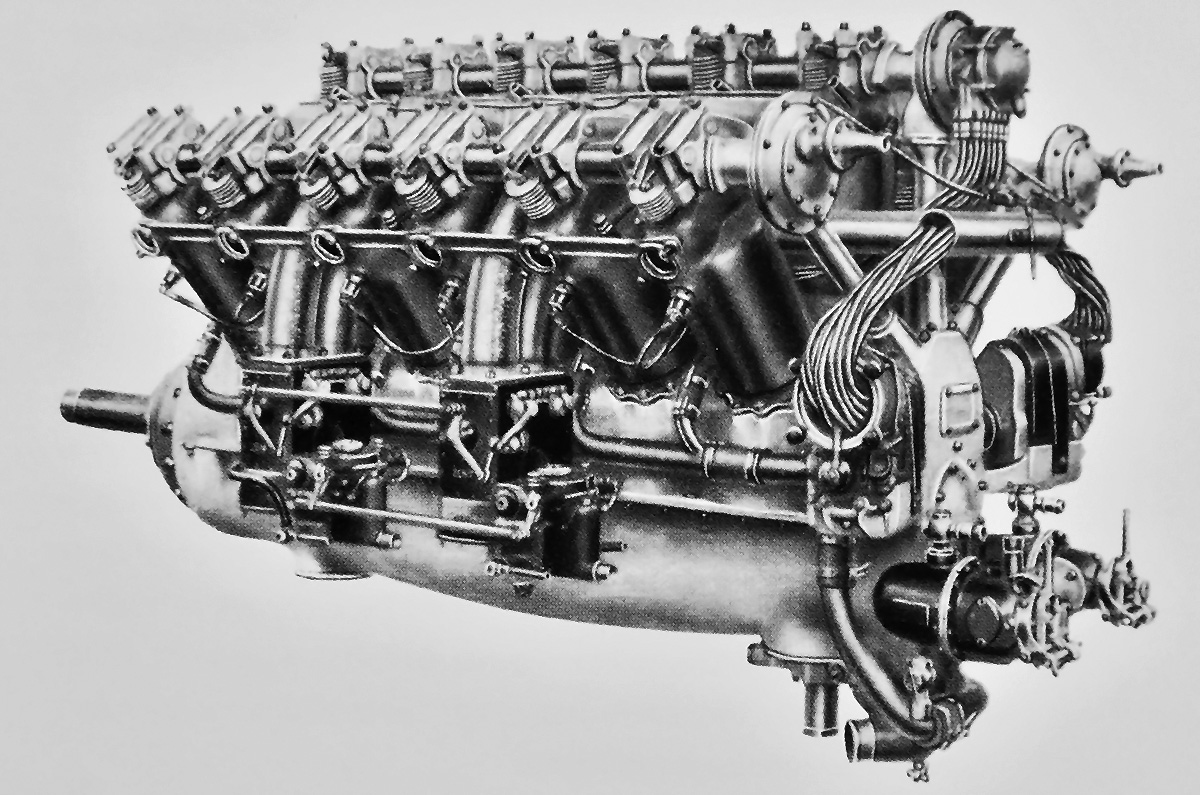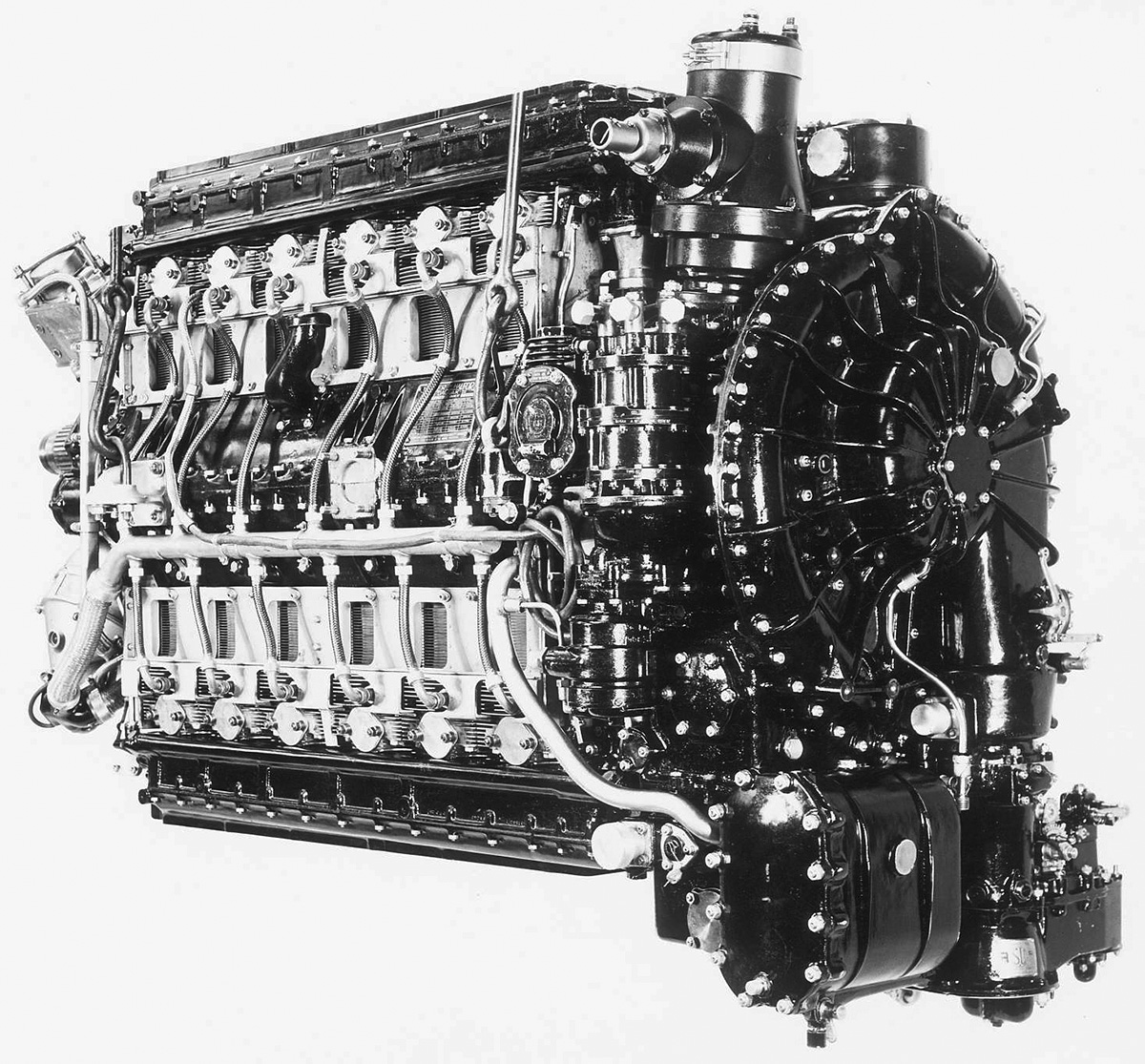 A direct-drive 12E-series engine with exposed valves and overhead camshafts. Unseen are the magnetos positioned at the rear of the engine.