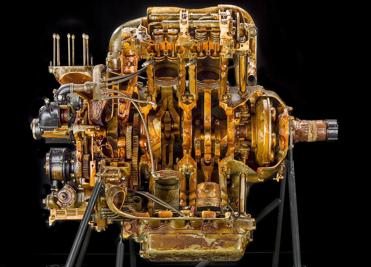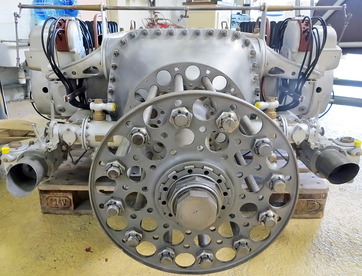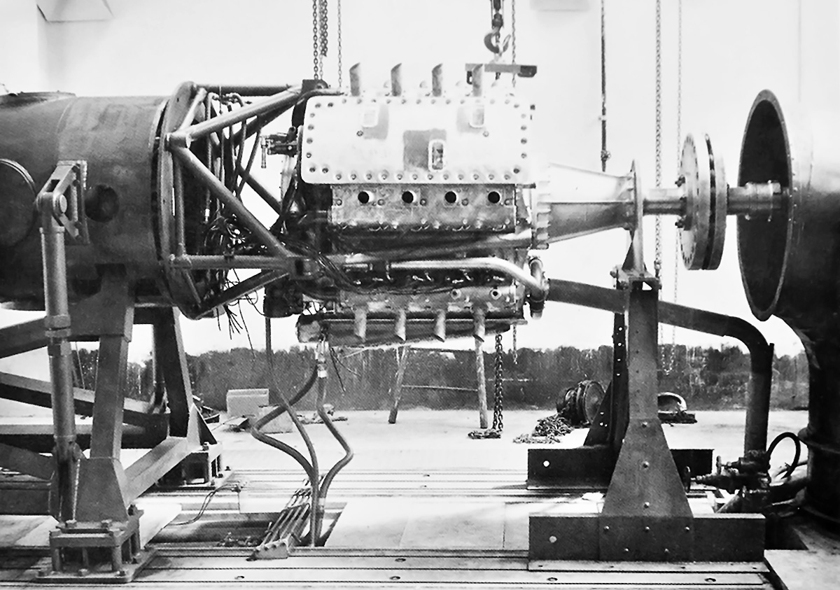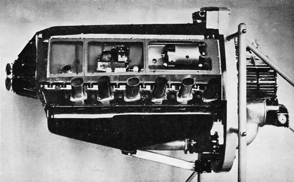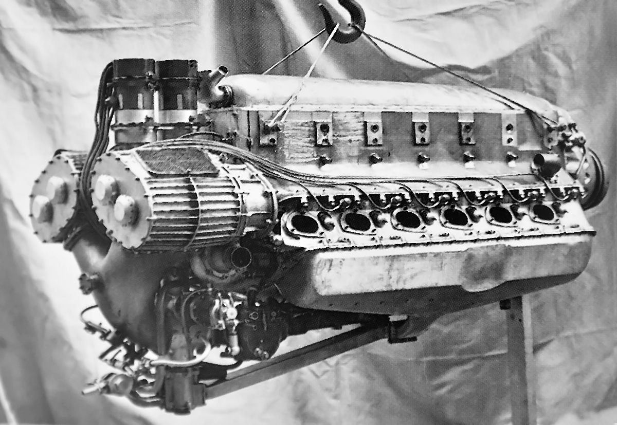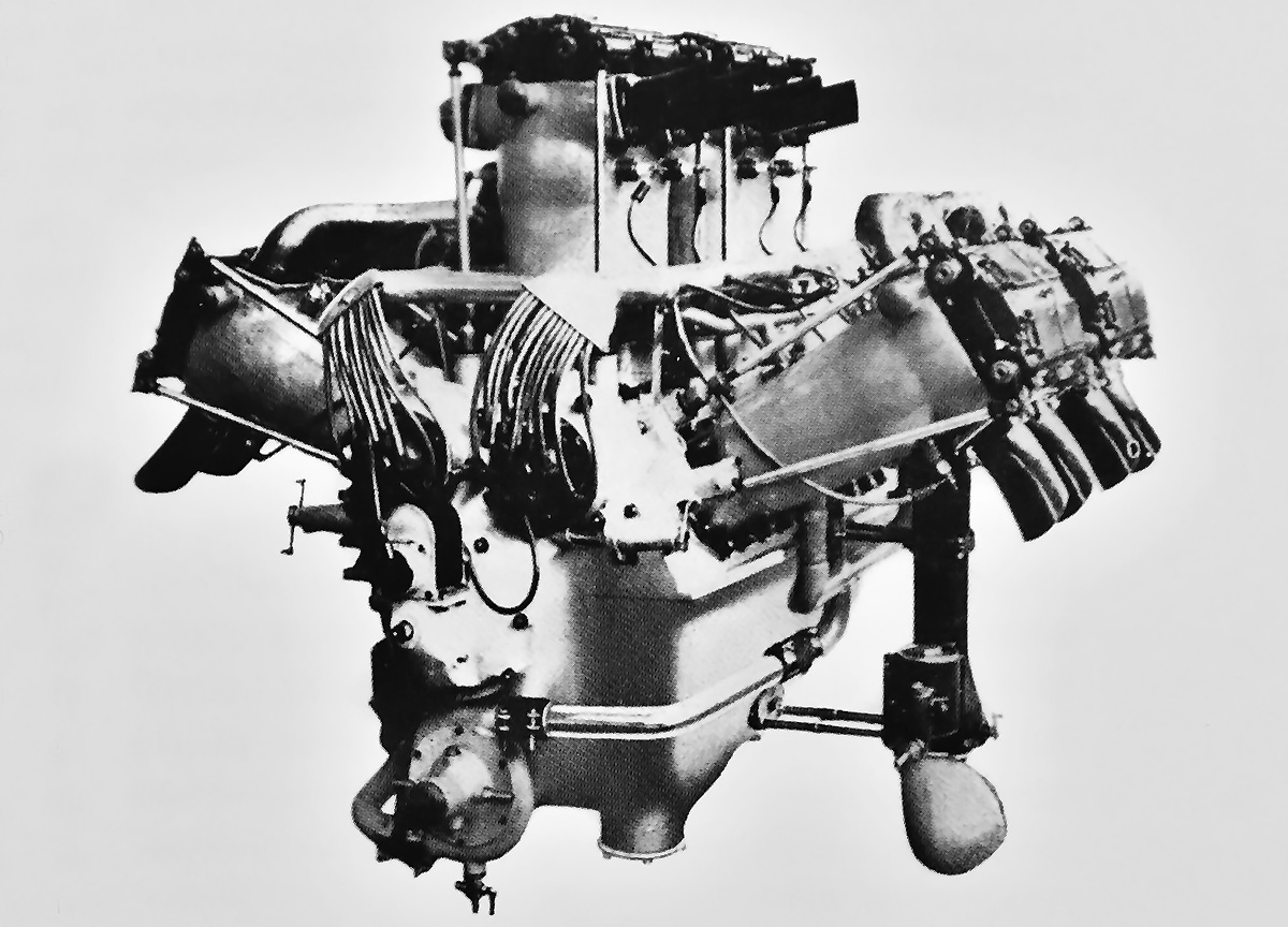 A direct-drive 12E-series engine with exposed valves and overhead camshafts. Unseen are the magnetos positioned at the rear of the engine.