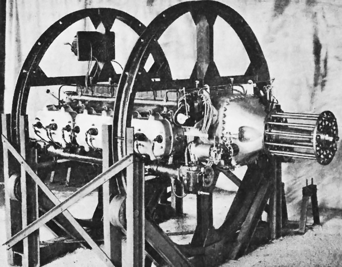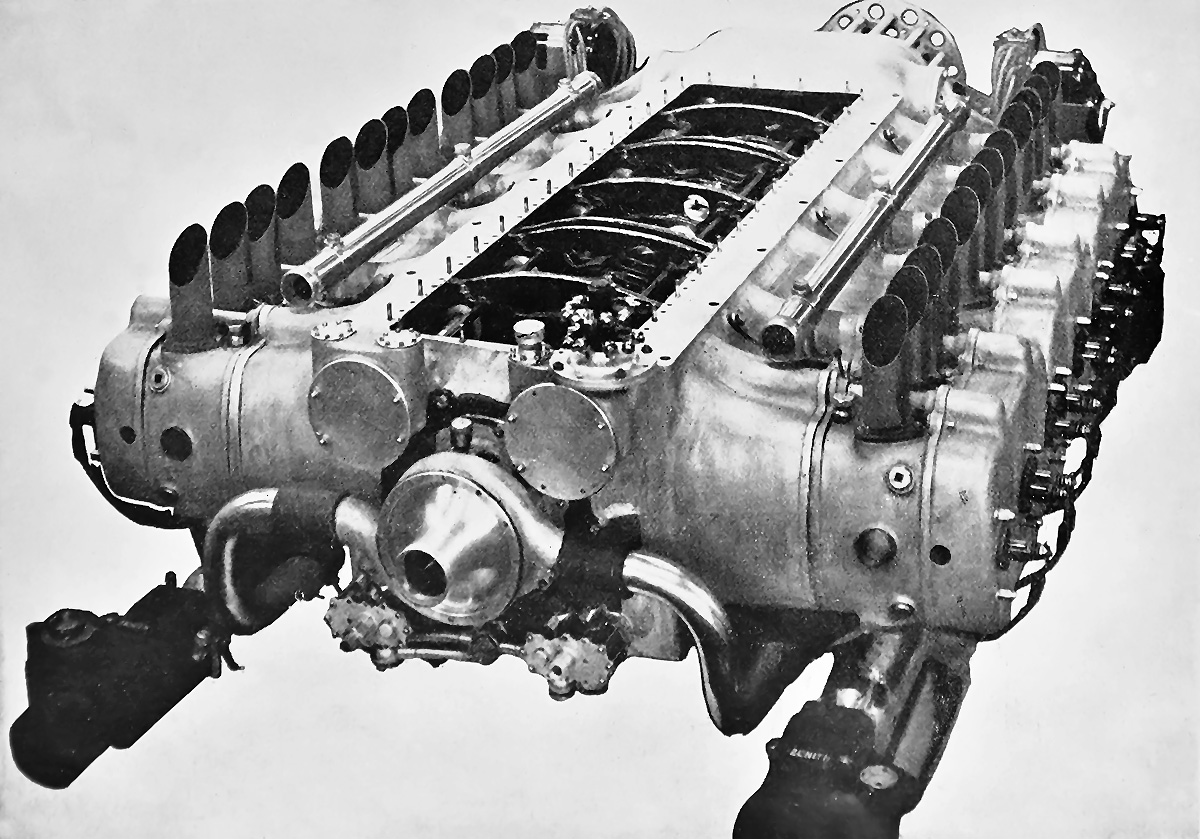 With a new crankcase, crankshaft, and camshafts, the 24-cylinder 24G of 1919 was more than just two 12F engines coupled together. Note the ignition system driven from the propeller shaft.