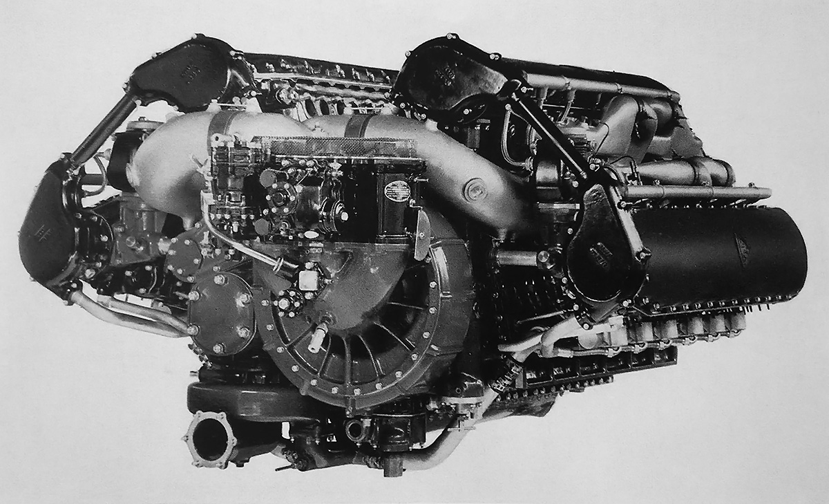 The SPA-Faccioli N.1 engine with its four cylinders, each housing two opposed pistons. At the rear of the engine (bottom of image) is the cross shaft linking the two crankshafts. Note the gear on the cross shaft that drove the camshaft.