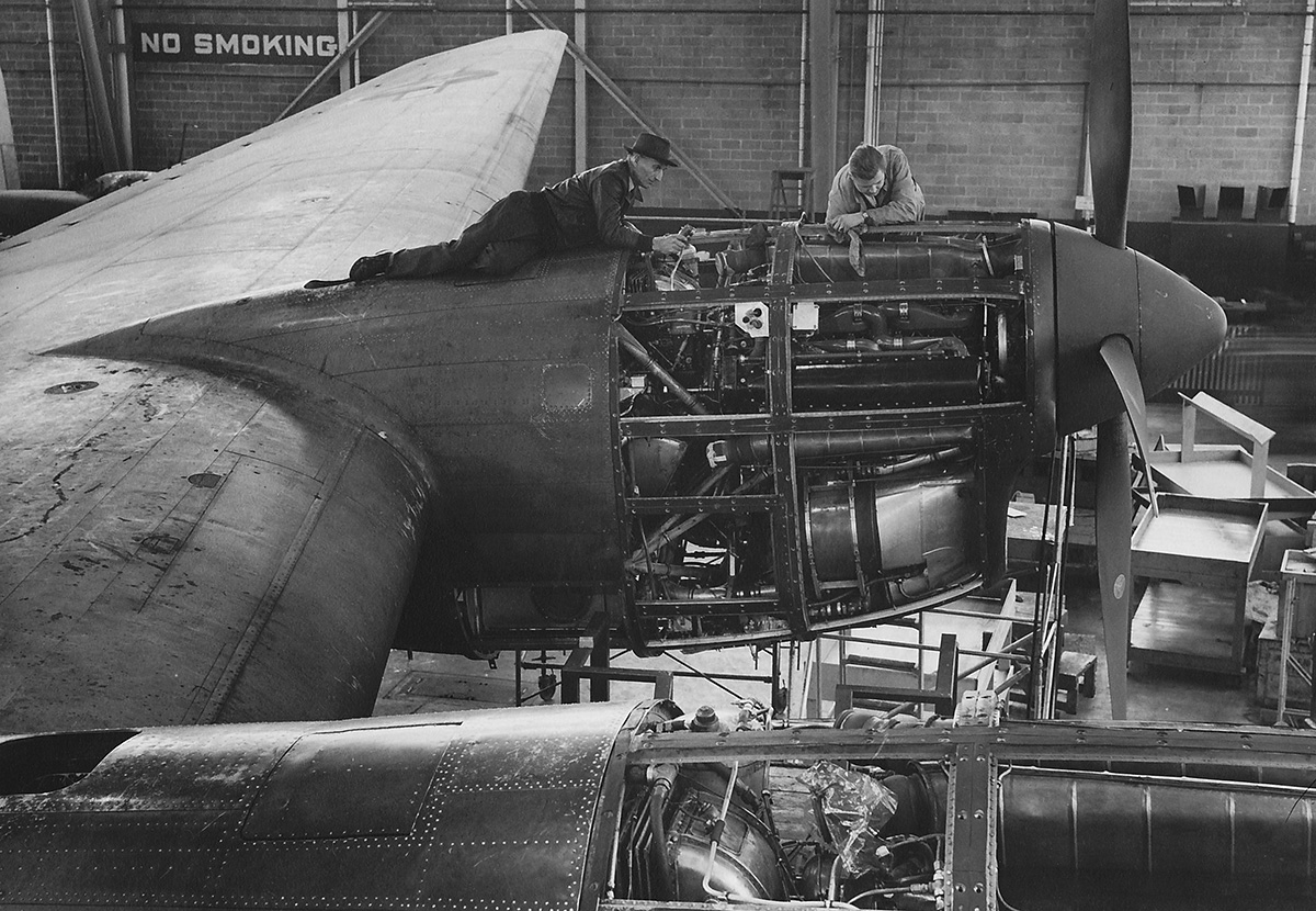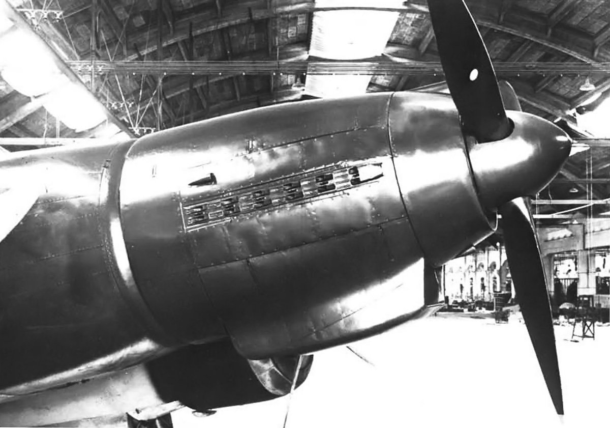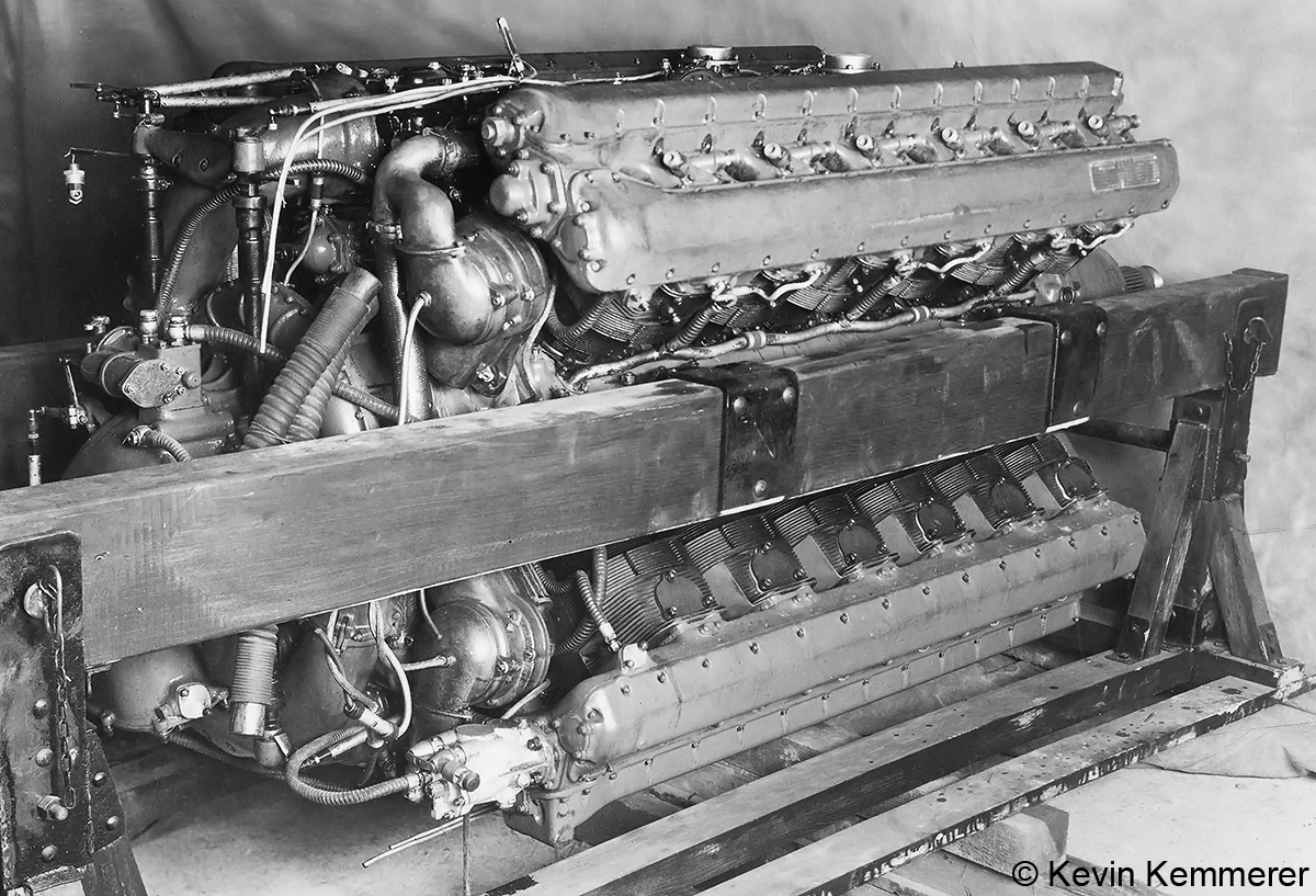 This rear view of the N.4 engine shows how the cross shaft also acted as the camshaft and directly drove the pushrods. The valves in the foreground are for the intake. The port for the intake manifold can just be seen at the center of the engine. Note the mounts for the magnetos and that the engine is upside-down in its display stand. (Museum of Applied Arts & Sciences image)