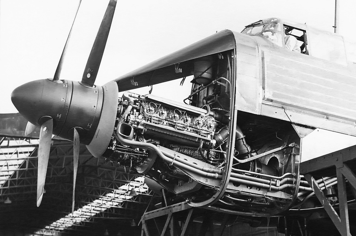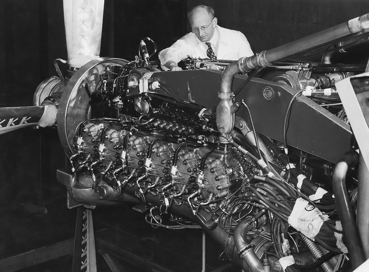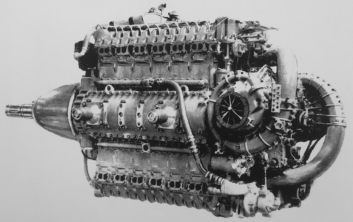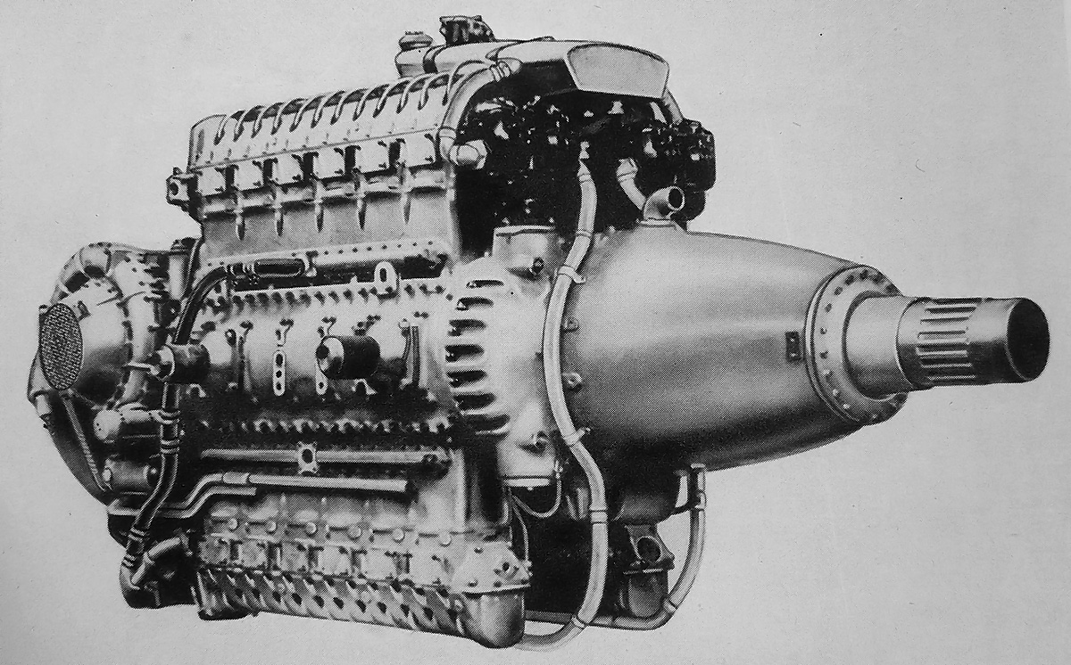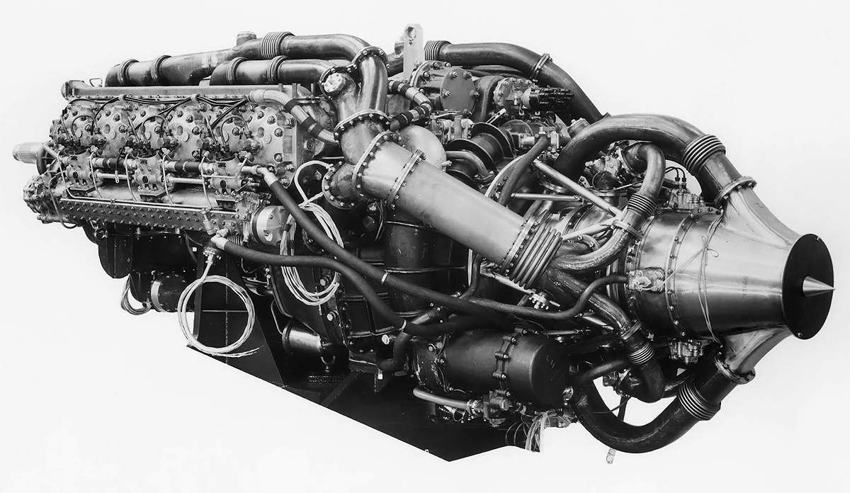The engine’s two-piece magnesium-zirconium alloy crankcase was split vertically and held together by 28 through bolts. A cast aluminum, six-cylinder, monobloc cylinder bank was attached to each side of the crankcase via studs. Wet cylinder liners were installed in the cylinder banks and covered with individual cylinder heads made from aluminum. A magnesium-alloy propeller gear reduction housing was secured via studs to the front of the crankcase. The housing also incorporated air intake on each of its lower sides. The intakes led to the compressor, which had an upper housing cast integral with the bottom of the crankcase, and a lower housing that was bolted on to the crankcase. Behind the compressor was a bifurcated air outlet, an oil sump, and the lower supercharger housing—all bolted to the crankcase.