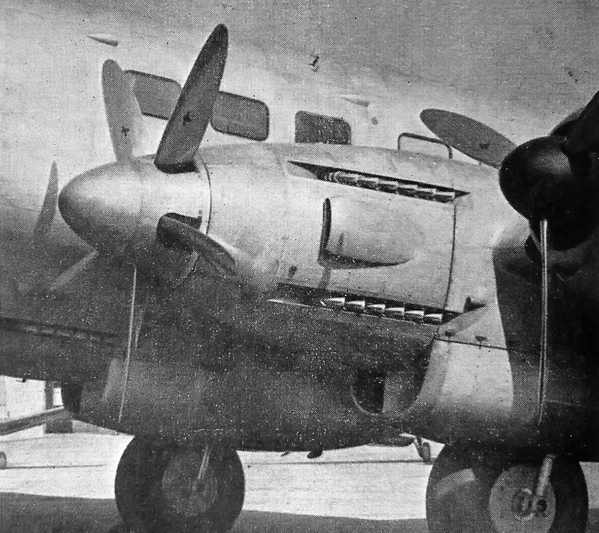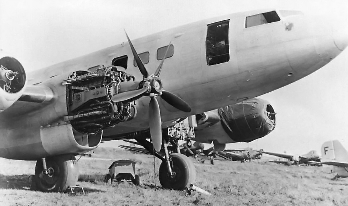 The exhaust turbines were mounted coaxially to the same shaft. This turbine shaft extended forward to power the compressor and led into the propeller gear reduction housing. The turbine shaft was geared to the front (outer) propeller of a contra-rotating set. The front propeller rotated counterclockwise. The rear (inner) propeller rotated clockwise and was geared to the crankshaft. There was nothing that linked the two propeller sets together, but they could not be run independently of each other. In other words, the piston engine section was needed to power the rear propeller, and the engine’s exhaust gases powered the turbine that was needed to run the front propeller. The turbine could not power itself, and the engine’s exhaust gases could not bypass the turbine.