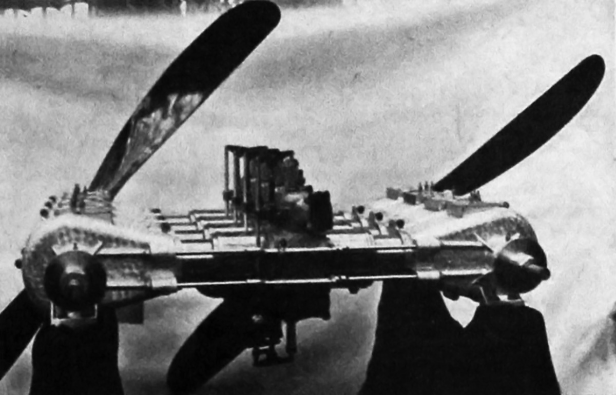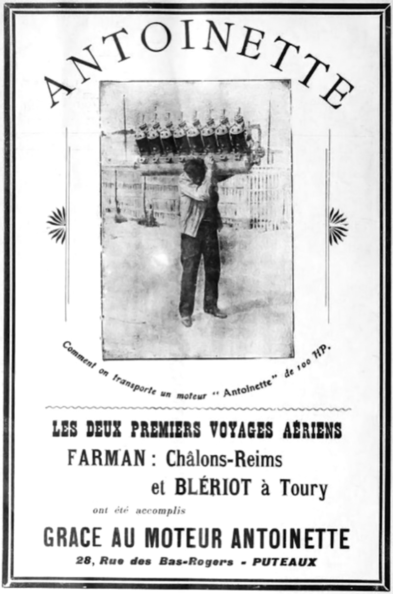 Antoinette engine ad circa 1907 illustrating the lightness of the 220 lb (100 kg), 100 hp (75 kw) V-16 engine.