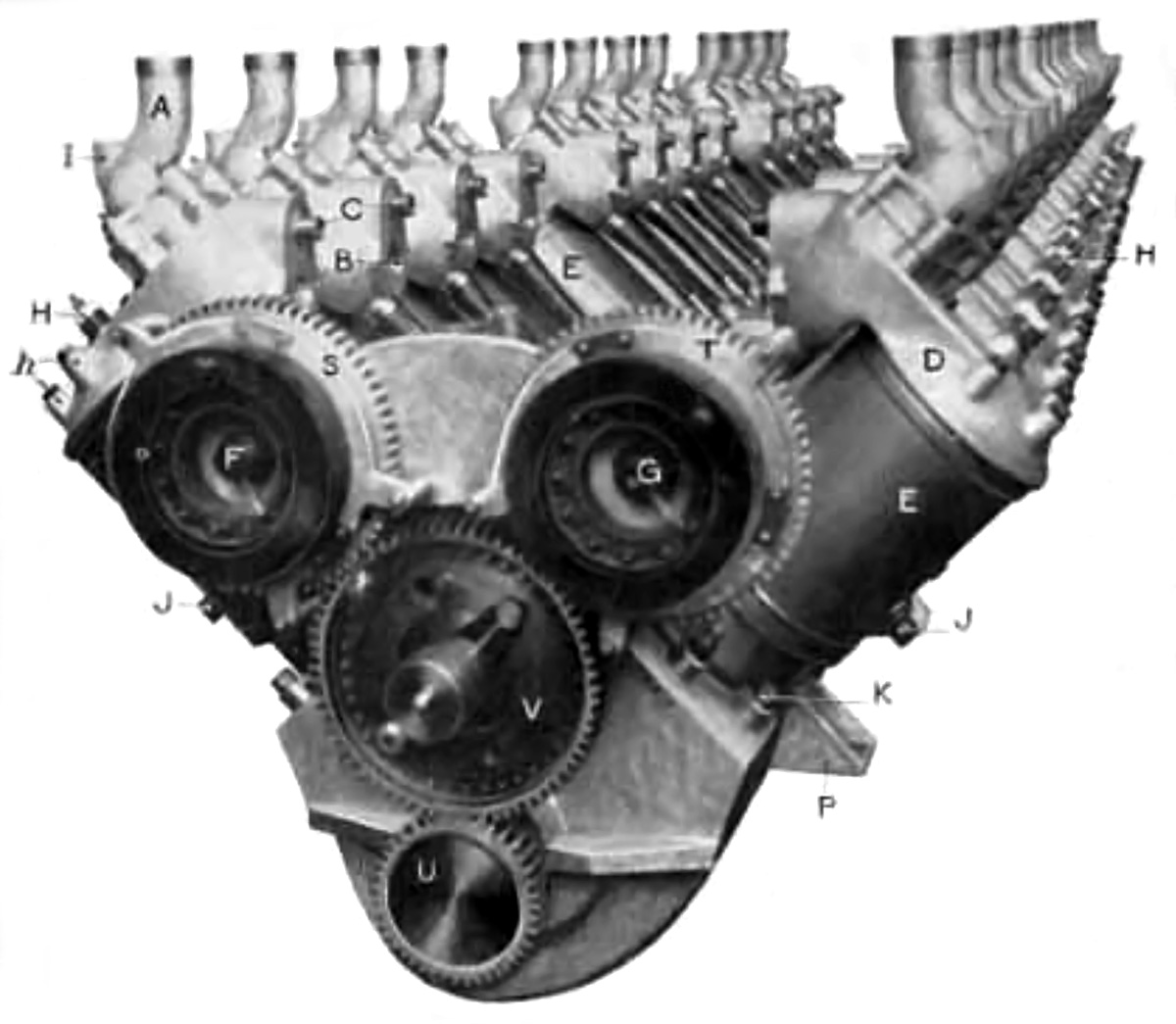 The 360 hp (268 kW) Antoinette V-24 marine engine of 1906. Unlike the V-16 engines, the V-24 appears to be comprised of V-8 engine sections. The engine is labeled as follows: A) air intake pipe; B) exhaust; C) cooling water outlet; D) aluminum cylinder head; E) steel cylinder covered with a brass water jacket sleeve; F and G) ignition distributors; H) spark plug; h) cylinder head bolts; I) fuel distributor to the intake valve; J) cooling water inlet; K) cylinder mounting bolt; P) engine mounting flange; S and T) gears for the ignition distributors; U) crankshaft gear; V) camshaft gear.