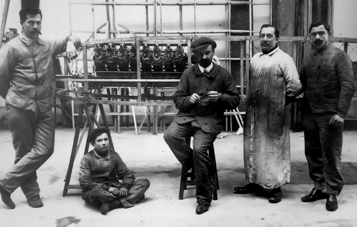 A Bléroit IX aircraft under construction in 1908 with a 50 hp (37 kW) Antoinette V-16 installed in its frame. From left to right, the Bléroit mechanics are Louis Peyret, Louis Paragot, M. Pelletier, Alfred Bertrand, and Julien Mamet.
