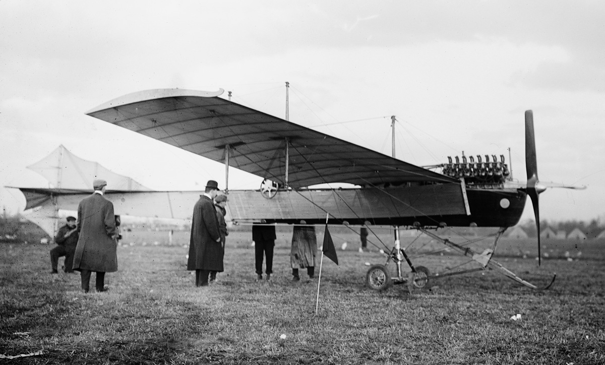 Latham’s 100 hp (75 kW) V-16-powered Antoinette VII aircraft at Belmont Park, New York in October 1910 for the Gordon Bennett Cup. Note the length of the condenser, which extends some 13 ft (4 m) along the side of the aircraft.