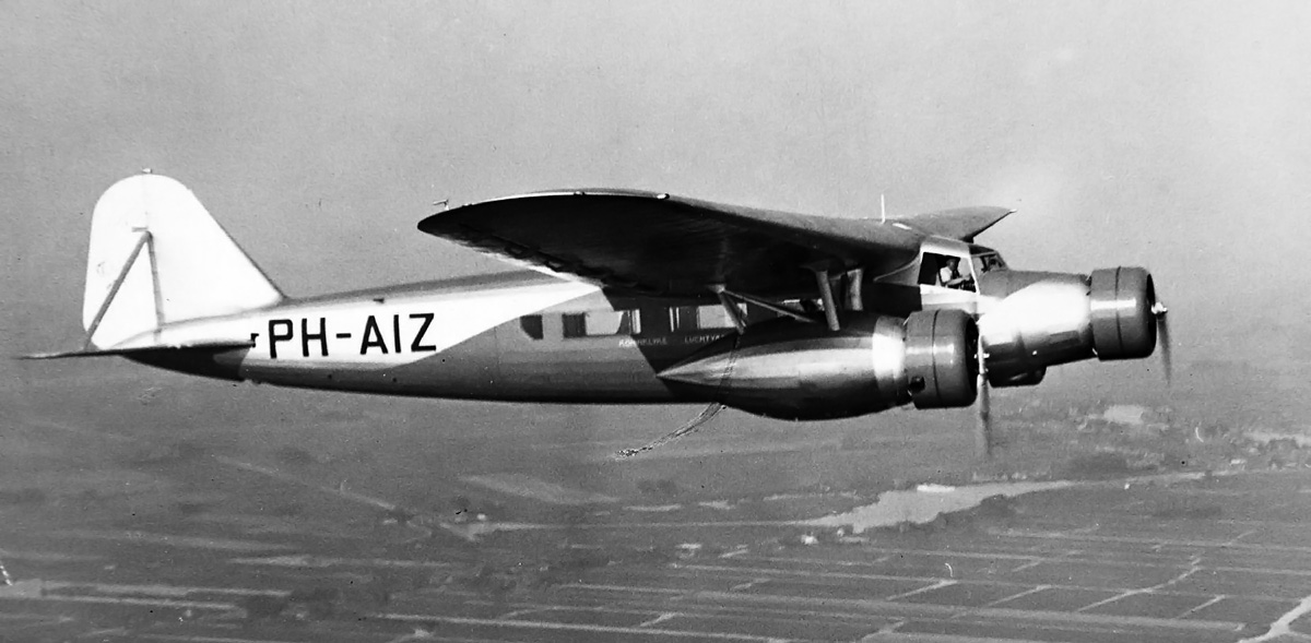 The aircraft was originally powered by three 650 hp (485 kW), nine-cylinder, air-cooled Wright Cyclone R-1820-F engines, all housed in NACA cowlings. One engine was in the nose of the aircraft, and the others were each in a nacelle suspended under each wing by struts. Later, KLM replaced the engines with more powerful 690 hp (515 kW) Wright Cyclone R-1820-F.2 engines. Metal, two-blade, ground-adjustable propellers were initially used. However, when the uprated engines were installed, metal Hamilton Standard propellers that were adjustable in-flight were used.