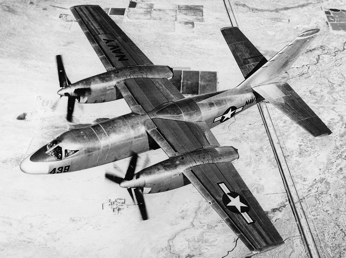 E-001 with its updated paint, which it still wears today. The two ducts under the aircraft were the inlet and exhaust for oil coolers. An open cooling air exit door is seen between the propeller and ventral fin. Subsequent prototypes used a fixed duct. Most images of E-001 in flight are without a spinner.