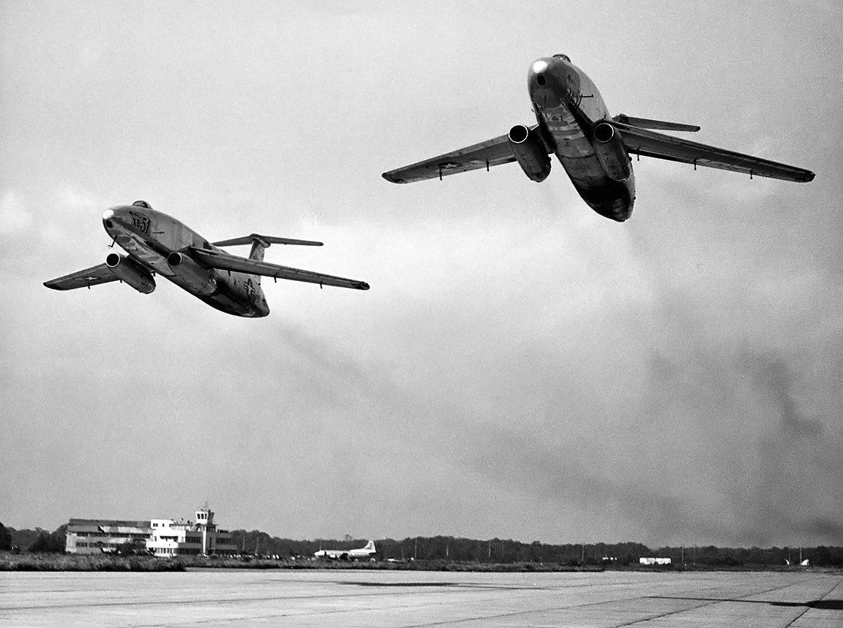 Cabin access was via a door located on the left side of the fuselage and just forward of the wing. The first prototype had a split upper and lower door, but subsequent examples had a single door that folded down to form stairs for cabin entry. The passenger compartment originally had six windows on its right side and five windows on its left side. However, none of the prototype aircraft had their full allotment of windows, and some of the “windows” were painted on. It seems the window on the door was eventually omitted. Pressurization provided a nominal pressure differential of 8.3 psi (.57 bar), enabling an 8,000 ft (2,438 m) cabin altitude while cruising at a 41,000 ft (12,497 km) flight altitude. The steerable nosewheel retracted forward into the nose of the aircraft.