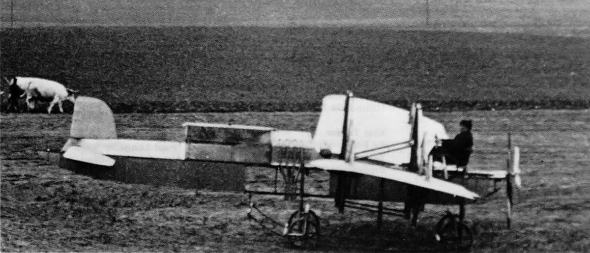 The ornithopter’s rudder can be seen in this rear view. Note the large control wheel in the cockpit and the fabric gap between the wings and fuselage.