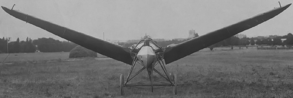 Front view of the DuBois-Riout ornithopter with the three-cylinder Viale engine. The engine cylinders can be seen protruding above the cowling. The wings are positioned around 20 degrees above horizontal. Note the quarter-turn belt drive for the wheel axle.