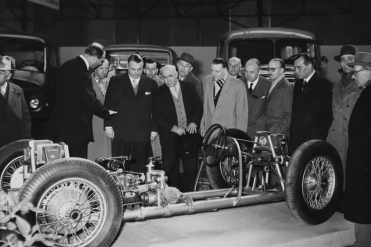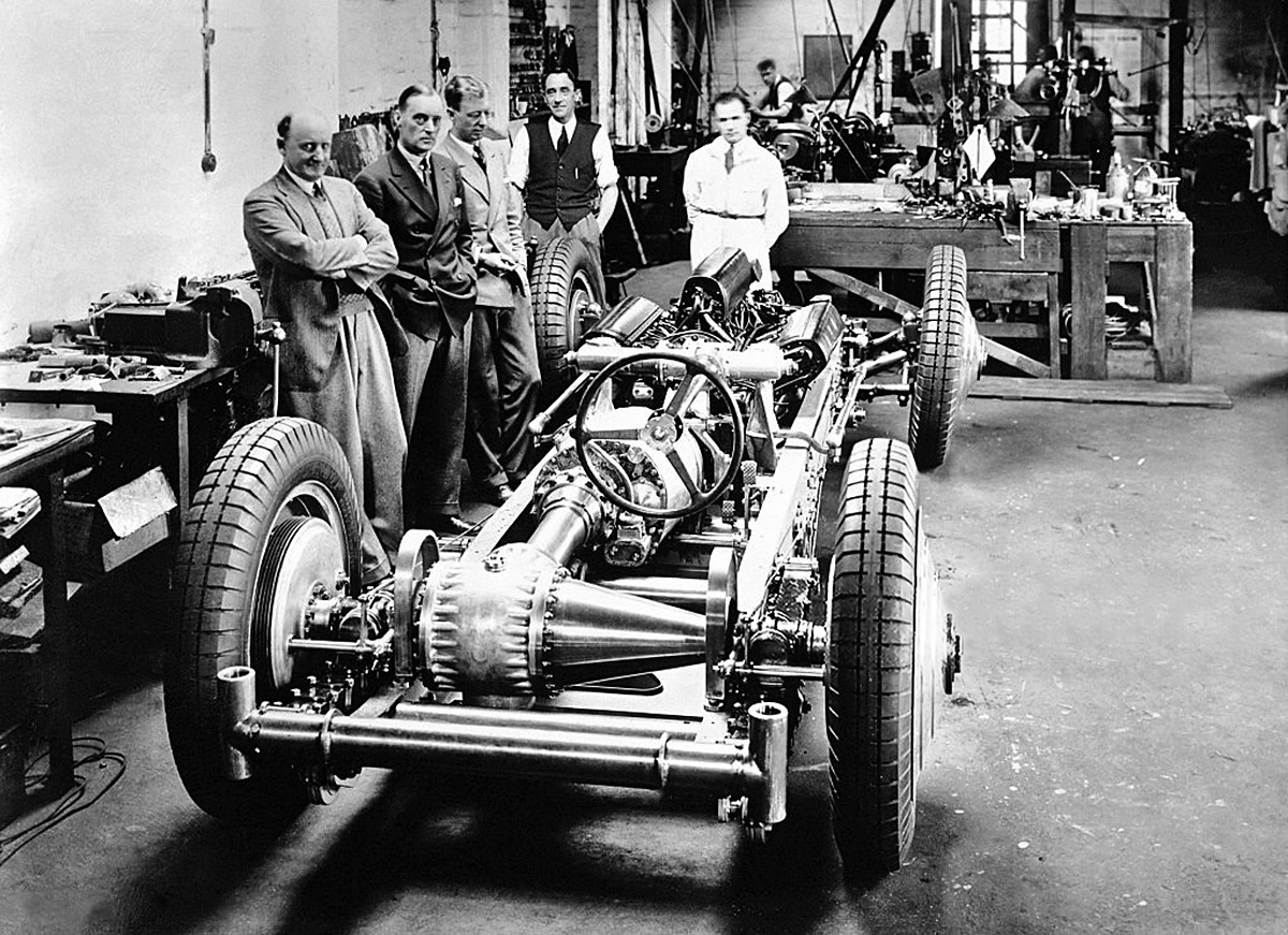 Rear view of the Railton shortly after its completion in 1938. Once the one-piece body was quickly removed, nearly all of the car’s components were accessible. The large water tank is on the left, and the air brake can be seen forward of the rear tires.