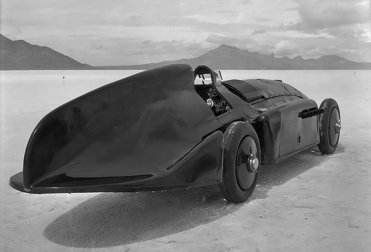 Front view of the Railton on the Salt Flats in 1938. The open covers at the bottom of the car allowed access for two of the body’s eight mounts. Note that the air brake has been removed, as Cobb found the driveshaft brakes more than adequate.