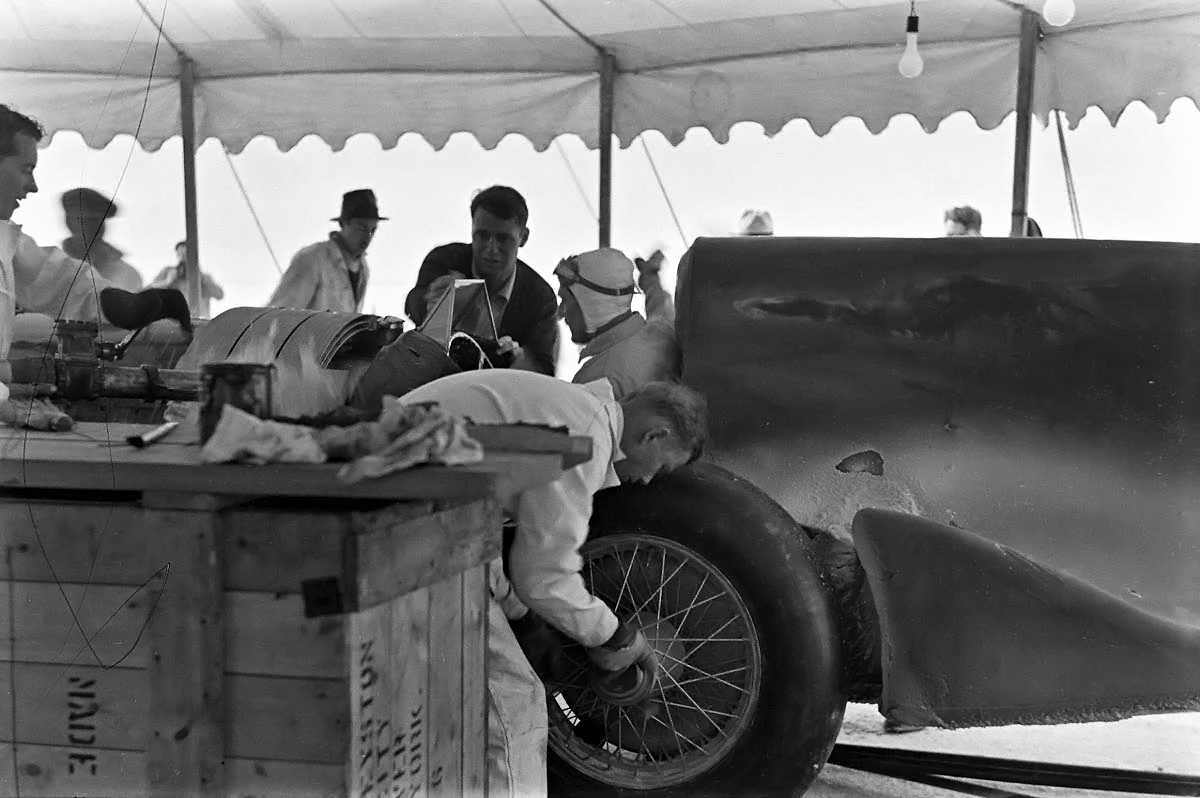 The Railton being prepared at Bonneville in 1939. The fuel tank has been relocated to the car’s port side, and a large ice tank has been added at the back of the car. The man by the body is painting the Gilmore Red Lion on the nose of the car.