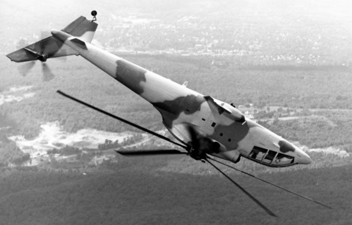 The blades of the XH-17 operating at 88 rpm were easily distinguished, even when the helicopter was in flight. Note the glow of the tip burners and the size of the GE J35 engine. (LIFE image via Google)