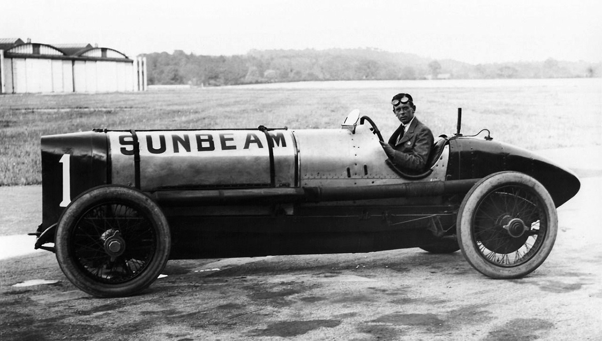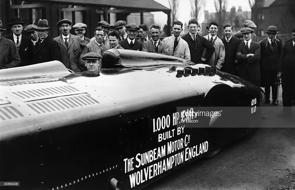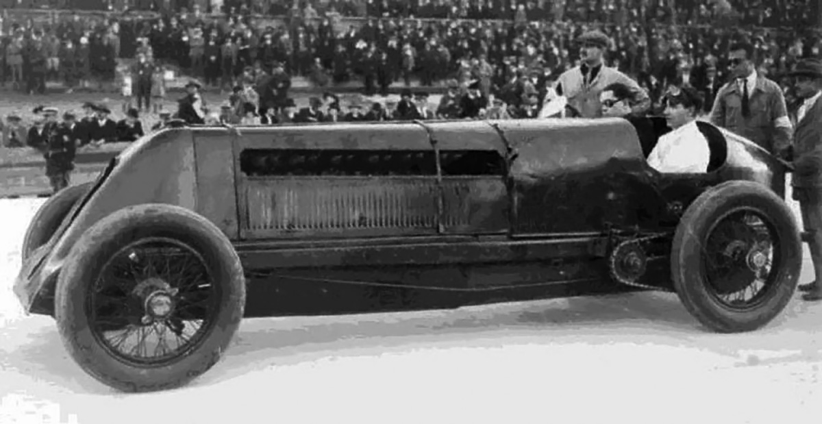 Ernest Eldridge sits in the highly-modified FIAT SB4, now lengthened and powered by a 300 hp (223 kW) A.12bis engine. The car is pictured at Brooklands in 1924.