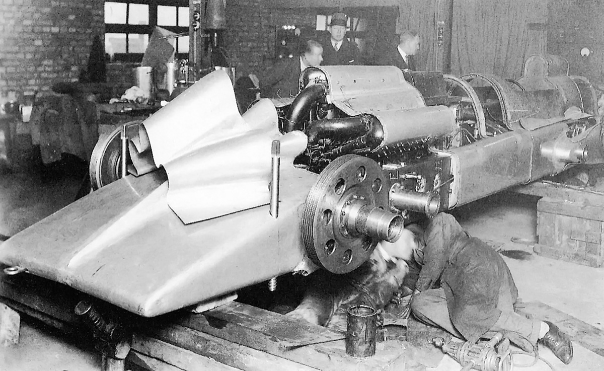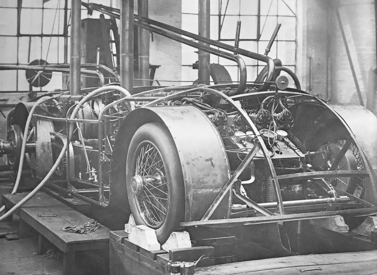 Eldridge with the new radiator cowling installed on Mephistopheles. Note the engine’s 12 open exhaust stacks. The car was run in this configuration at Montlhéry in 1925.