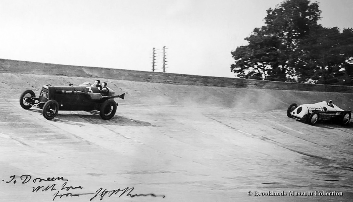 Eldridge and Ames in Mephistopheles leads John Godfrey Parry-Thomas in his Leyland-Thomas racer at Brooklands on 11 July 1925. Thomas would come back to win the three-lap match race, which involved both cars operating beyond their limits. Thomas set a Brooklands lap record during the race. (Brooklands Museum image)